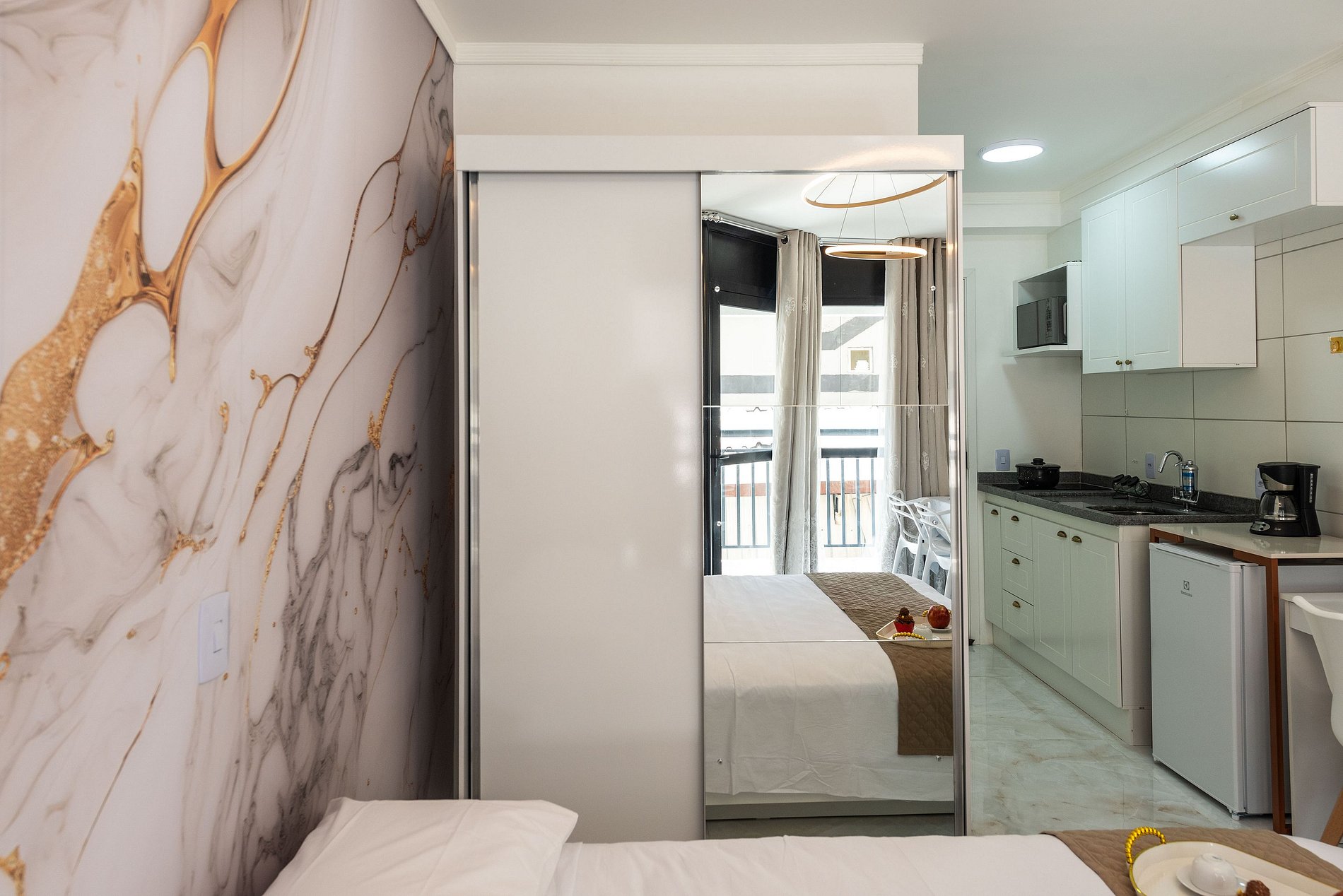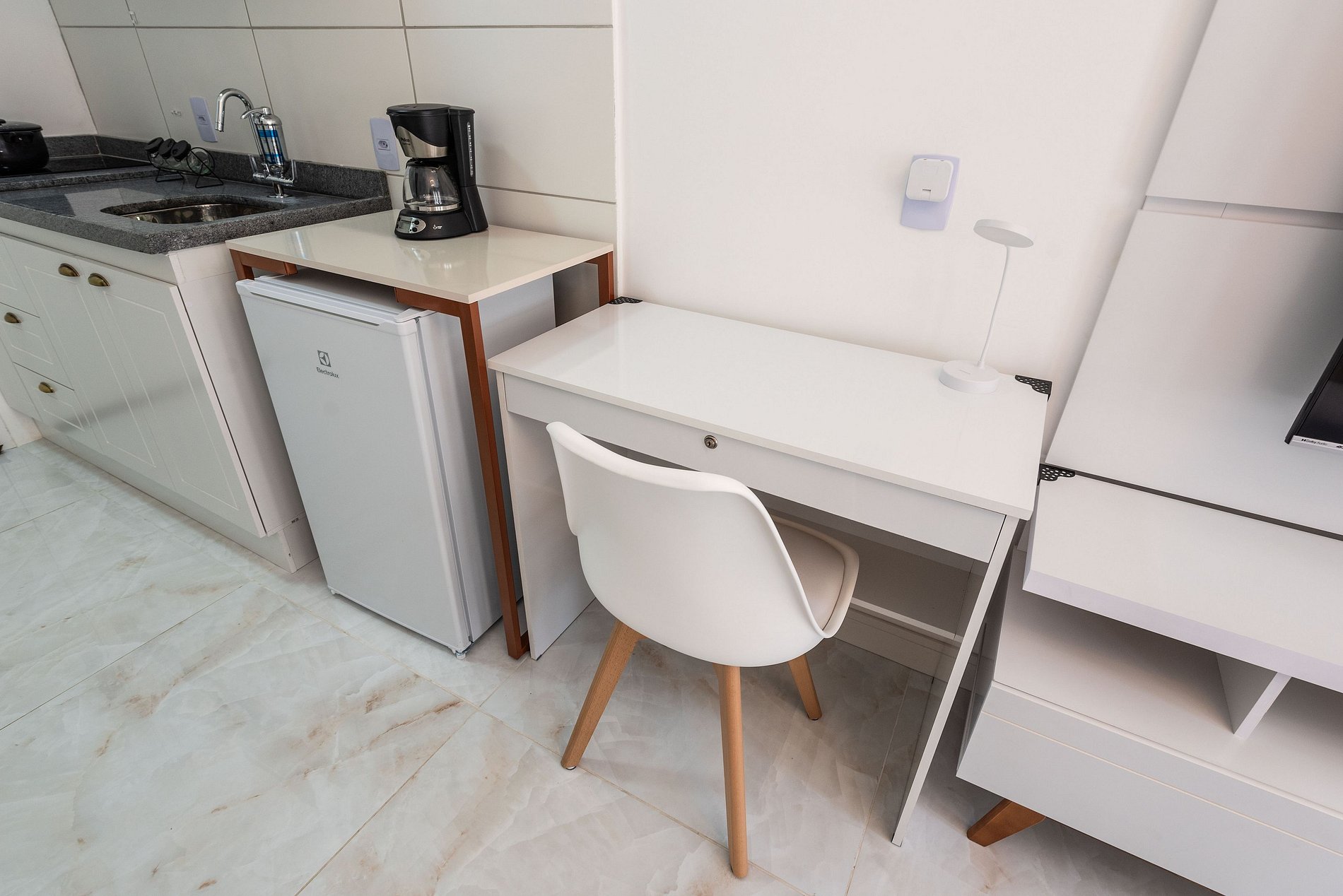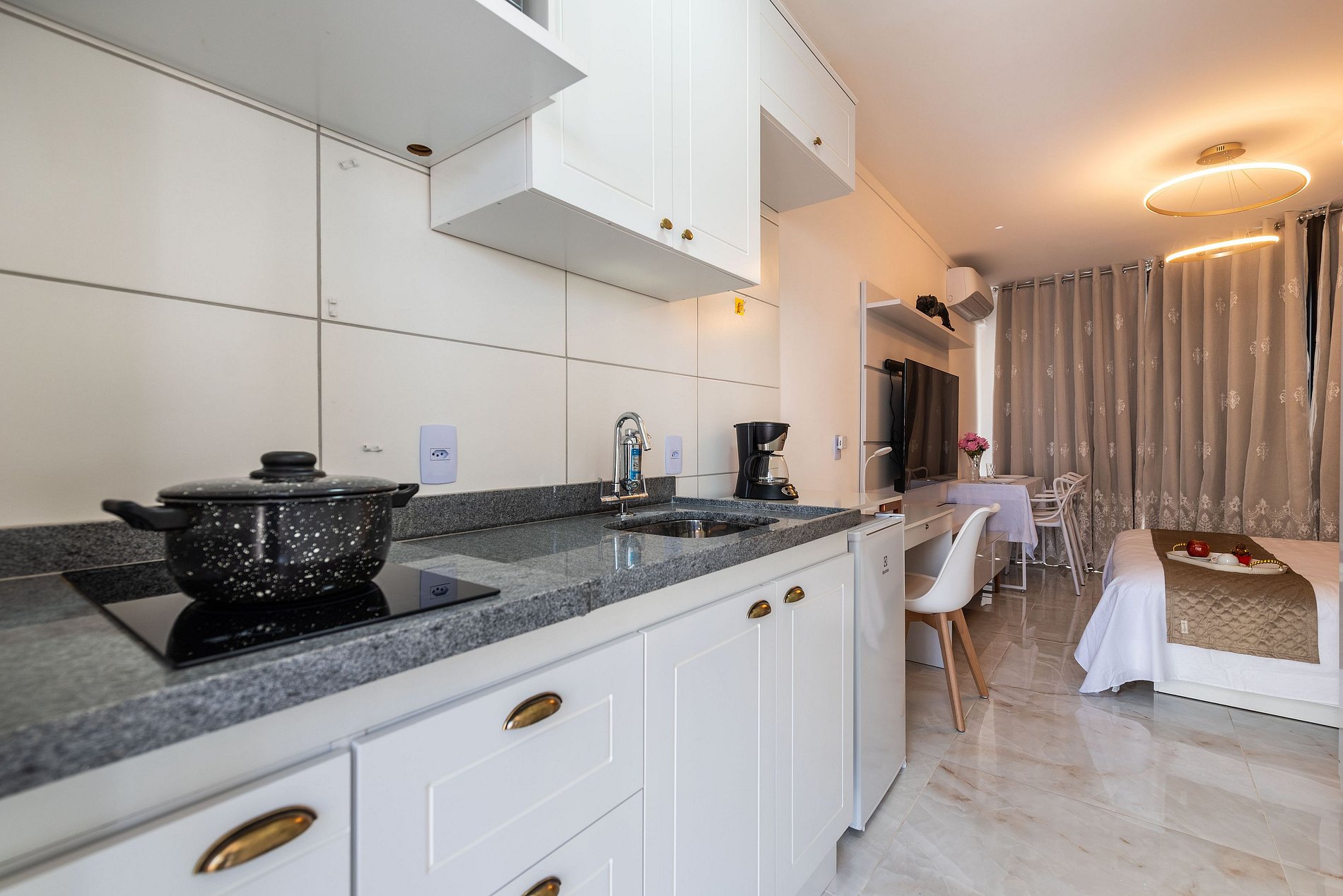 Cozinha compacta equipada (micro-ondas, frigobar, cooktop)