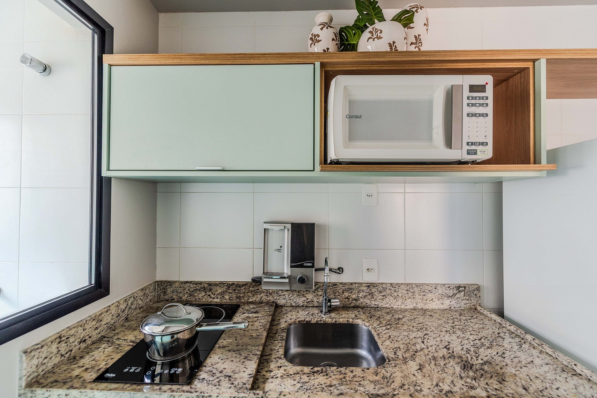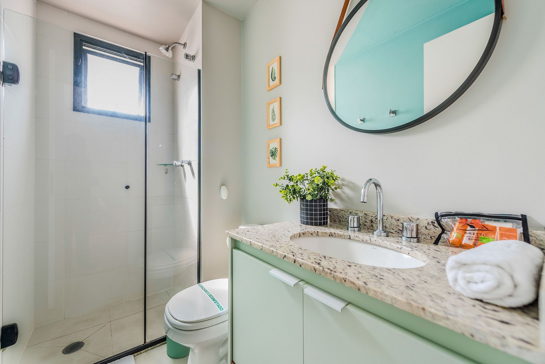 Este apartamento foi planejado para oferecer conforto e praticidade durante sua estadia em São Paulo. A decoração é moderna, clean e acolhedora, criando um ambiente leve para relaxar depois de um dia de passeios ou trabalho. O ar-condicionado no quarto garante noites agradáveis, a varanda traz luz natural e a vaga de garagem é um diferencial na região. A cozinha está equipada com o essencial para pequenas refeições, e o prédio oferece estrutura completa com portaria 24h, lounge, academia, mercadinho e lavanderia OMO inteligente.