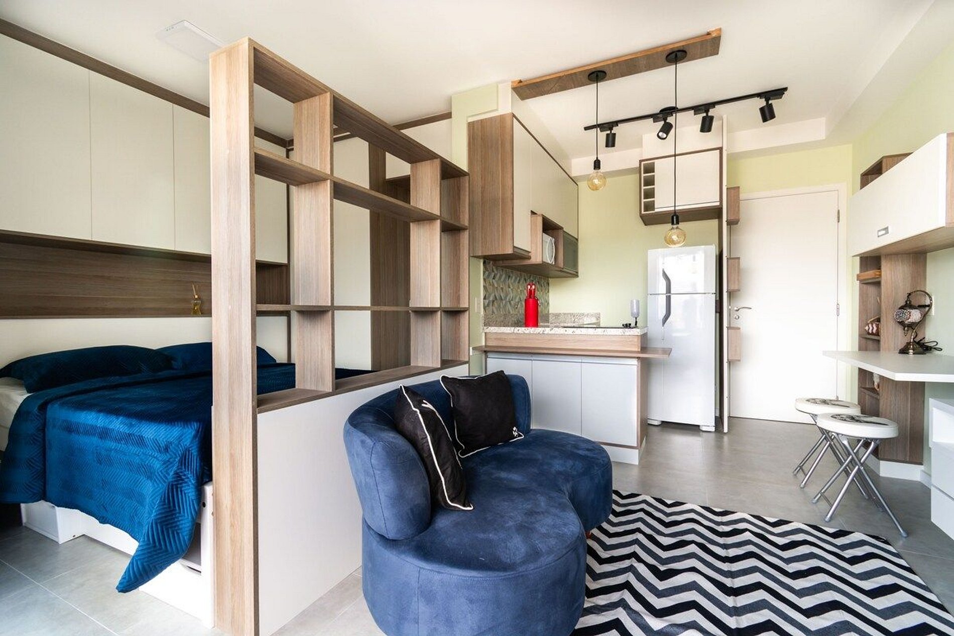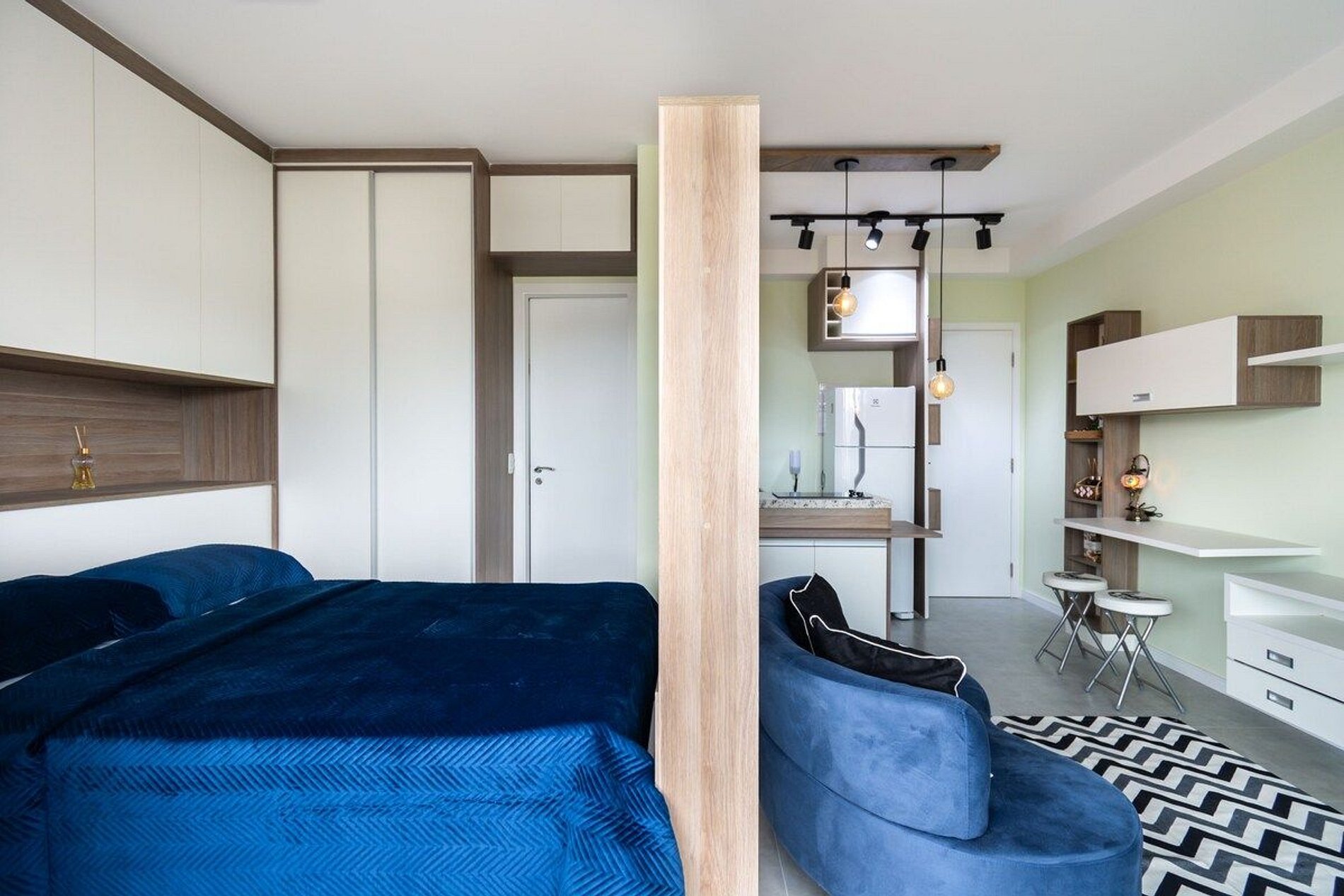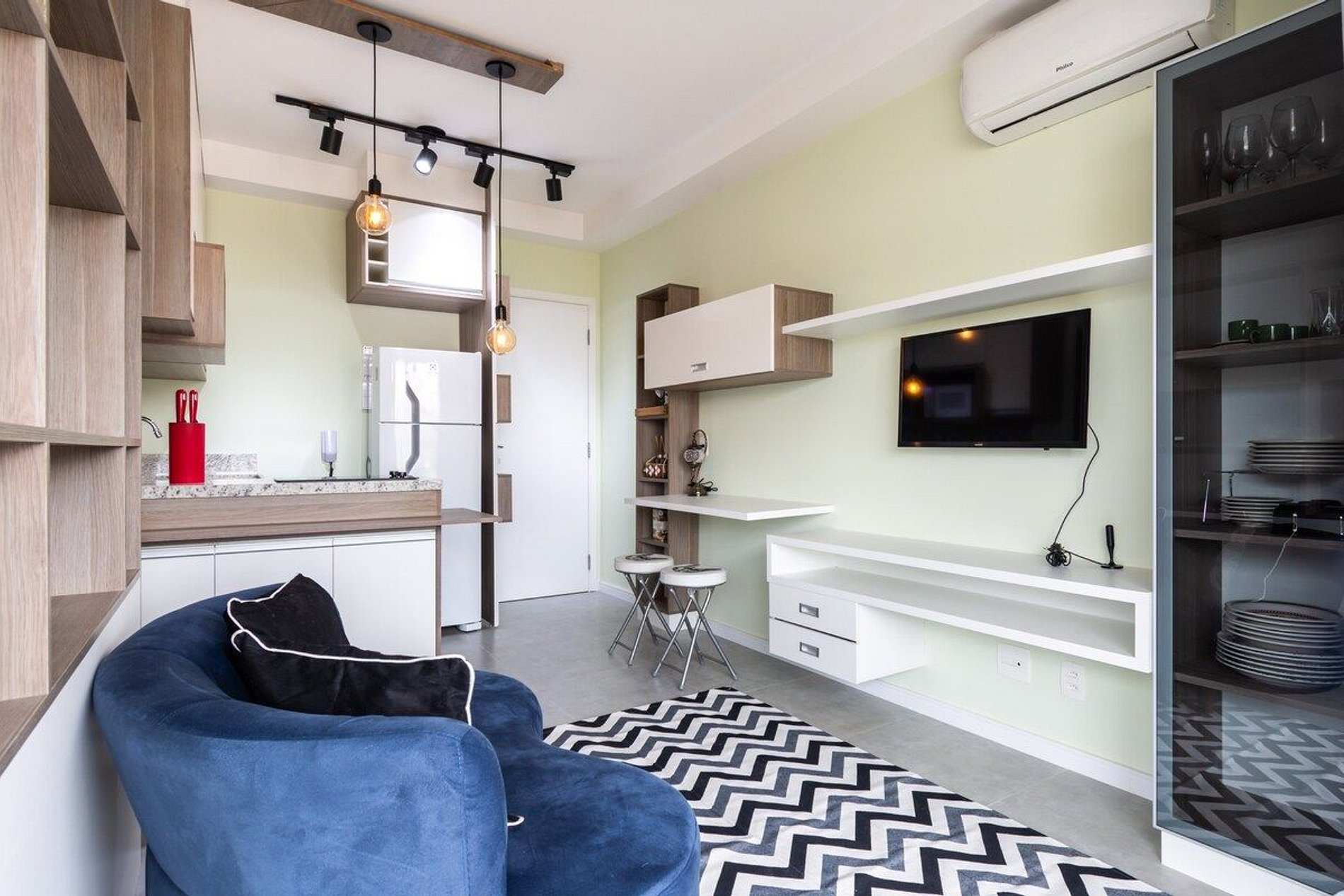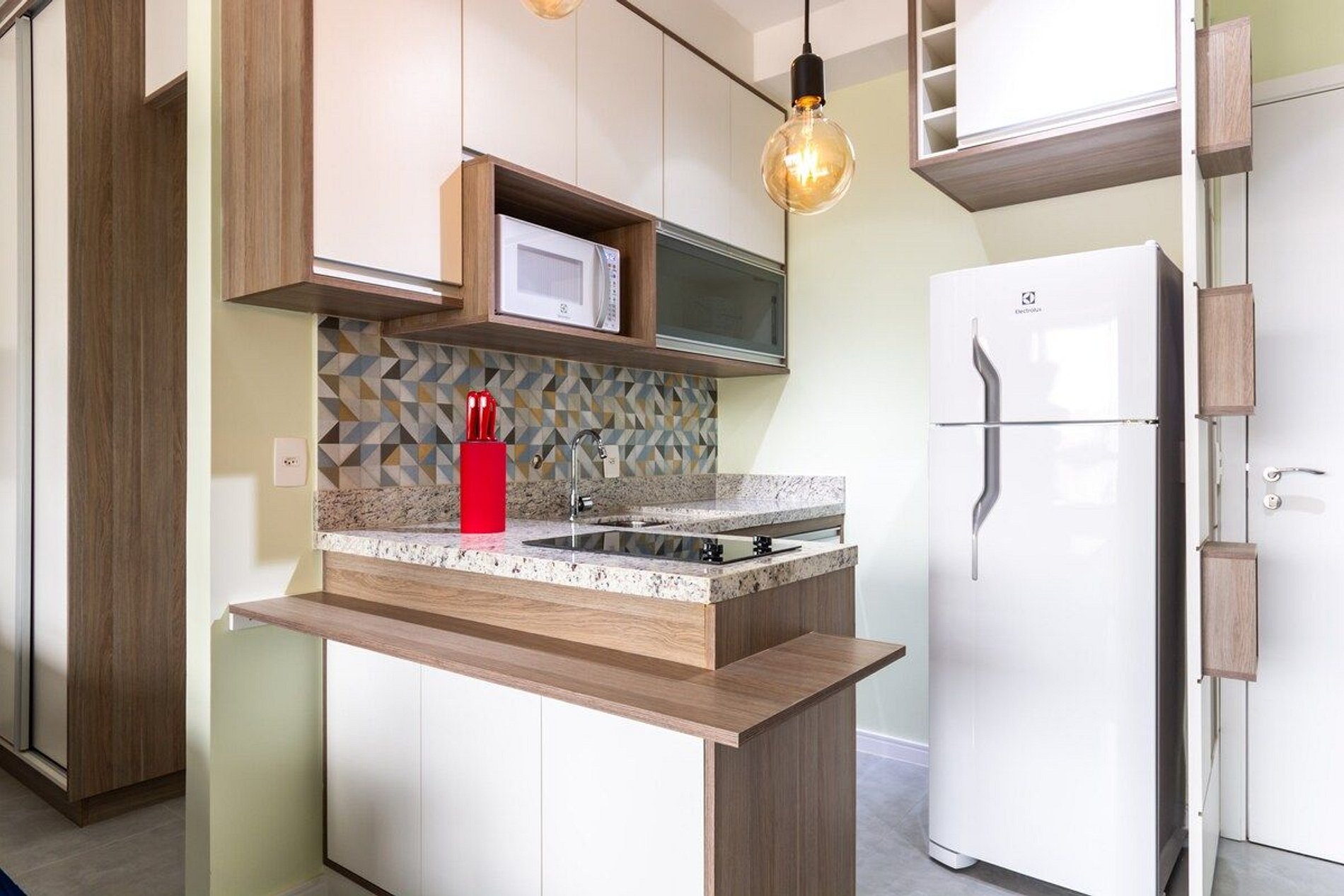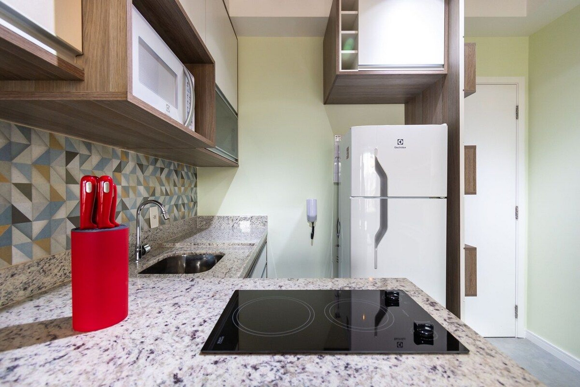 O espaço é compacto e funcional, encanta pela beleza e praticidade. Temos cooktop, forninho, ar condicionado e vista para a cidade, que a noite é lindo.