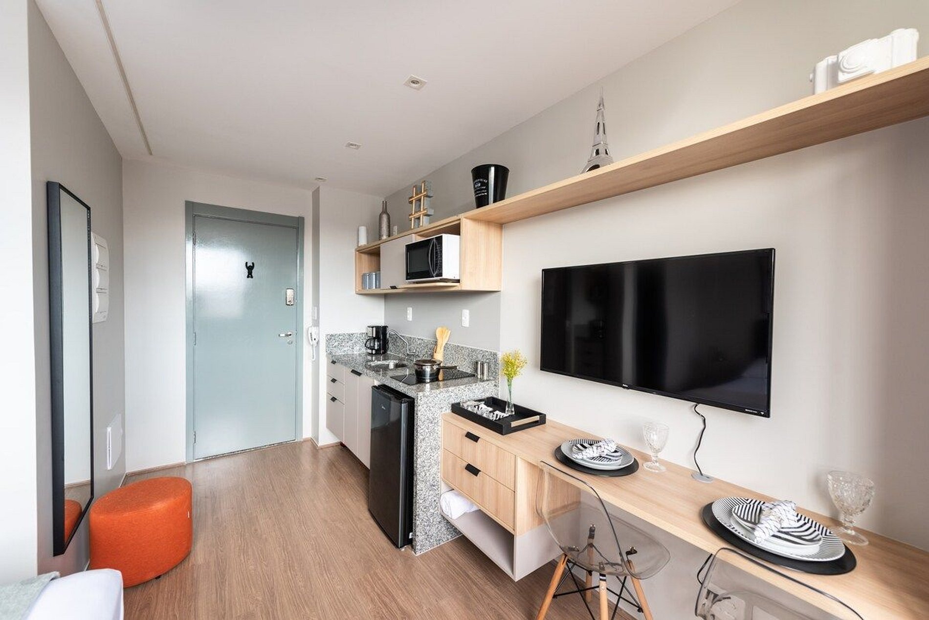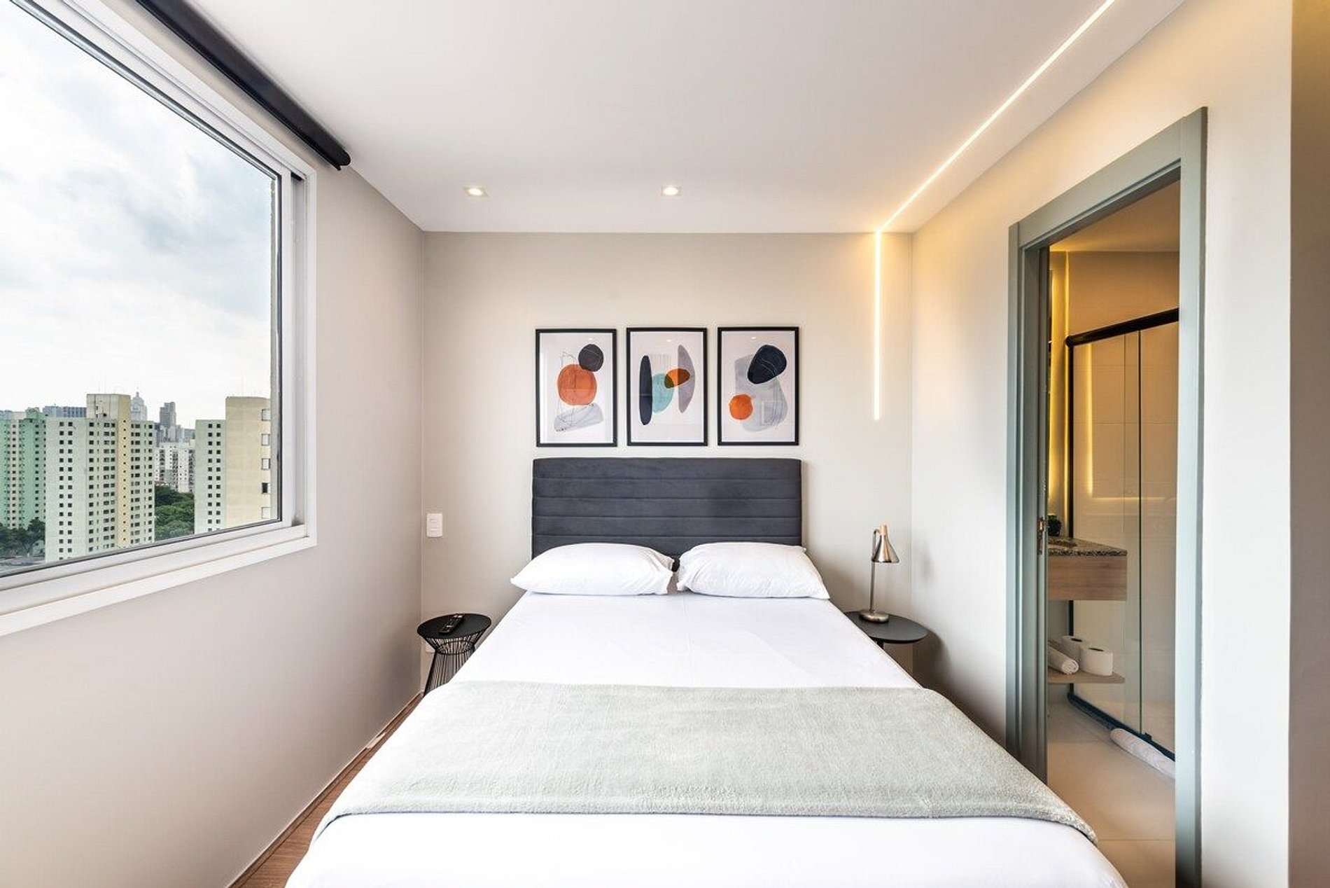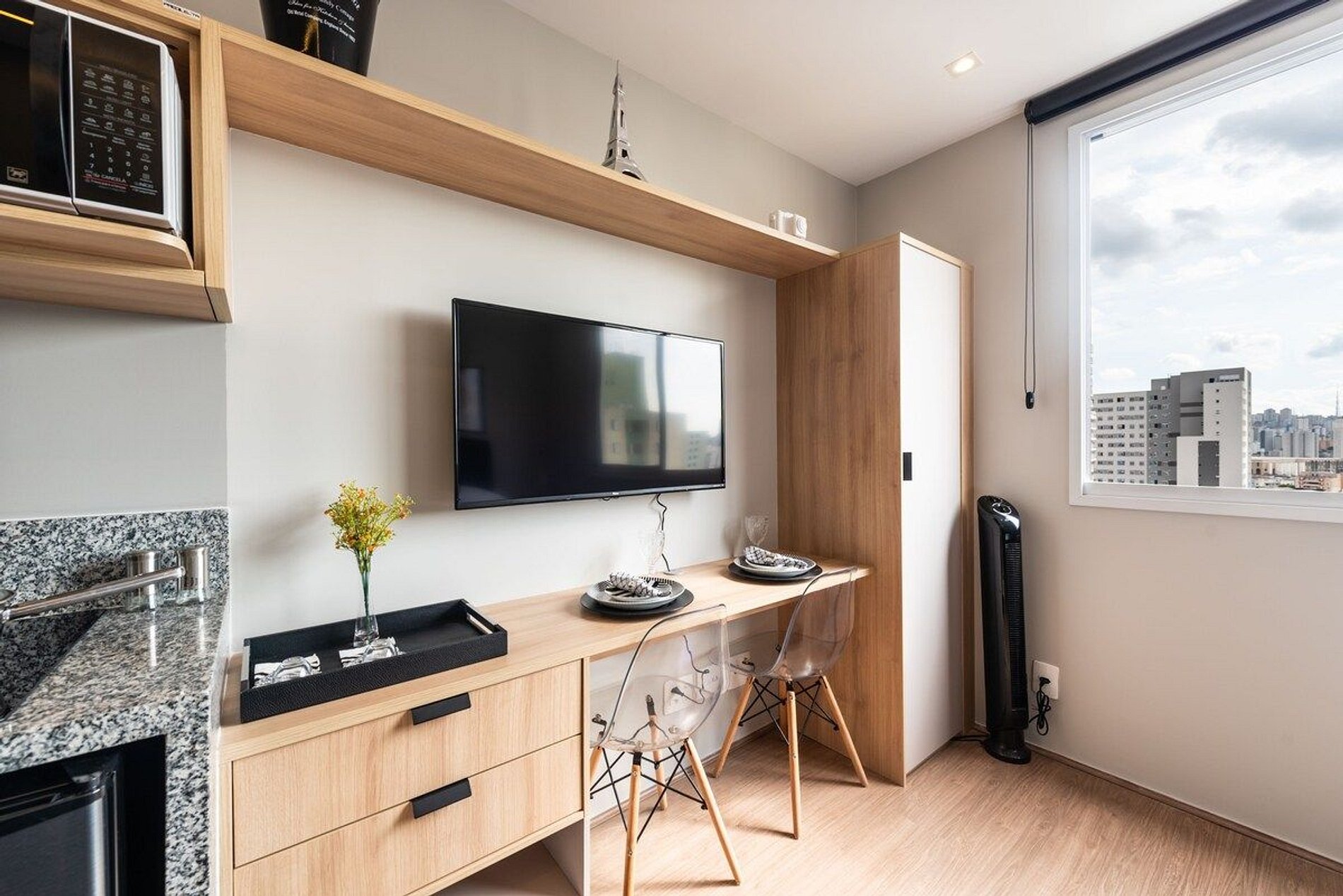 O studio fica em um prédio novo, construído em 2020, possui 18m2 e uma decoração minimalista e contemporânea. Seu andar é alto e possui uma vista legal do bairro e da cidade.