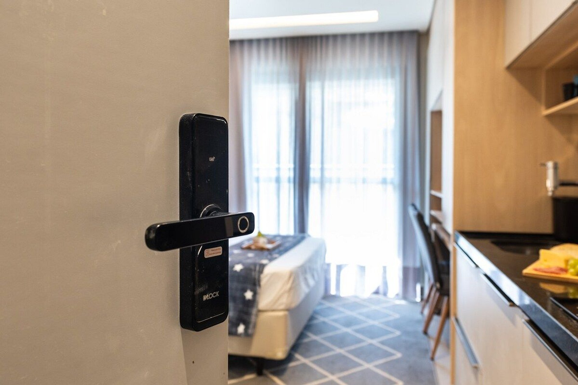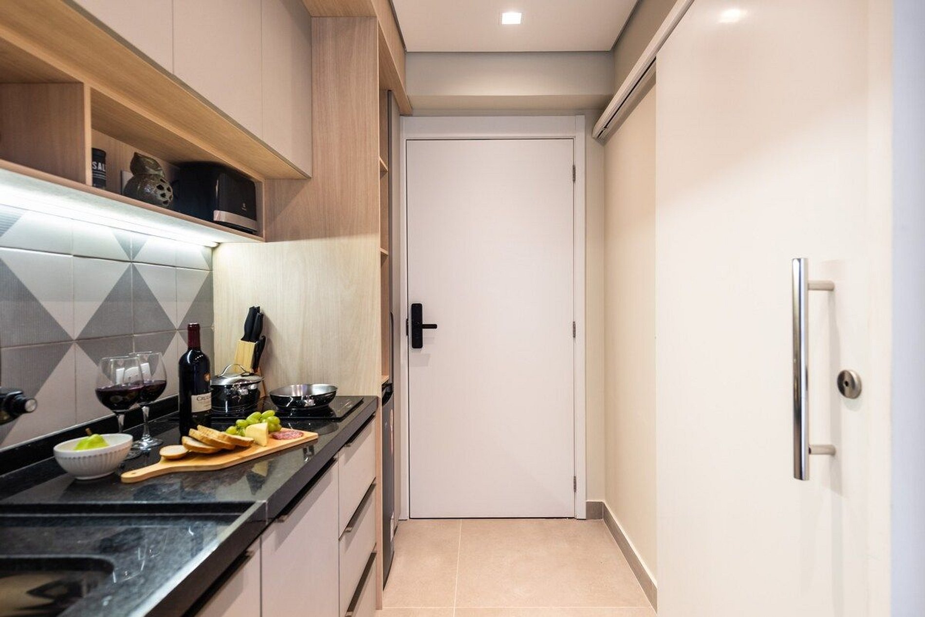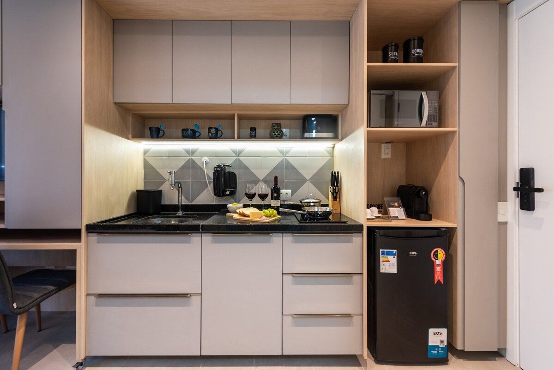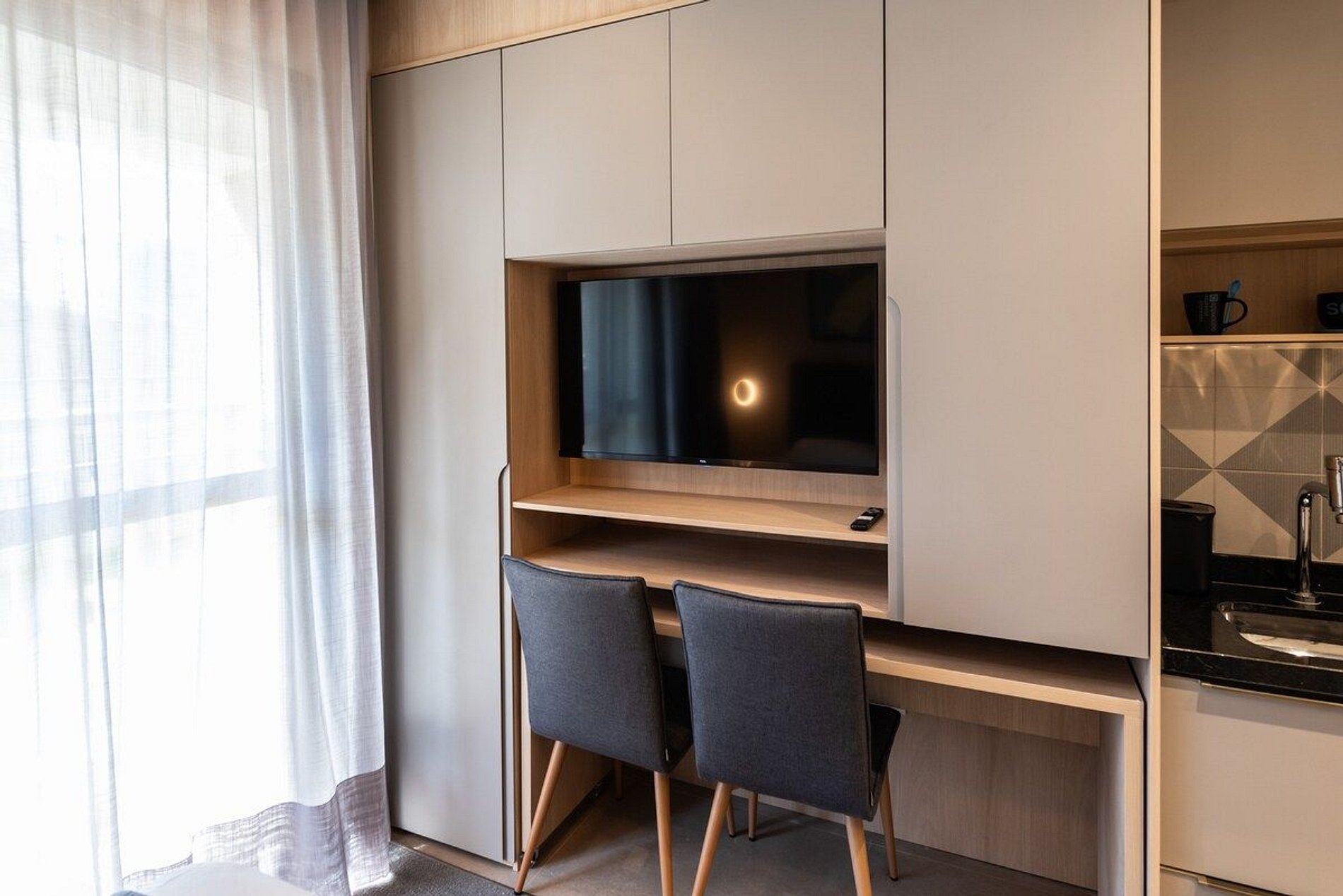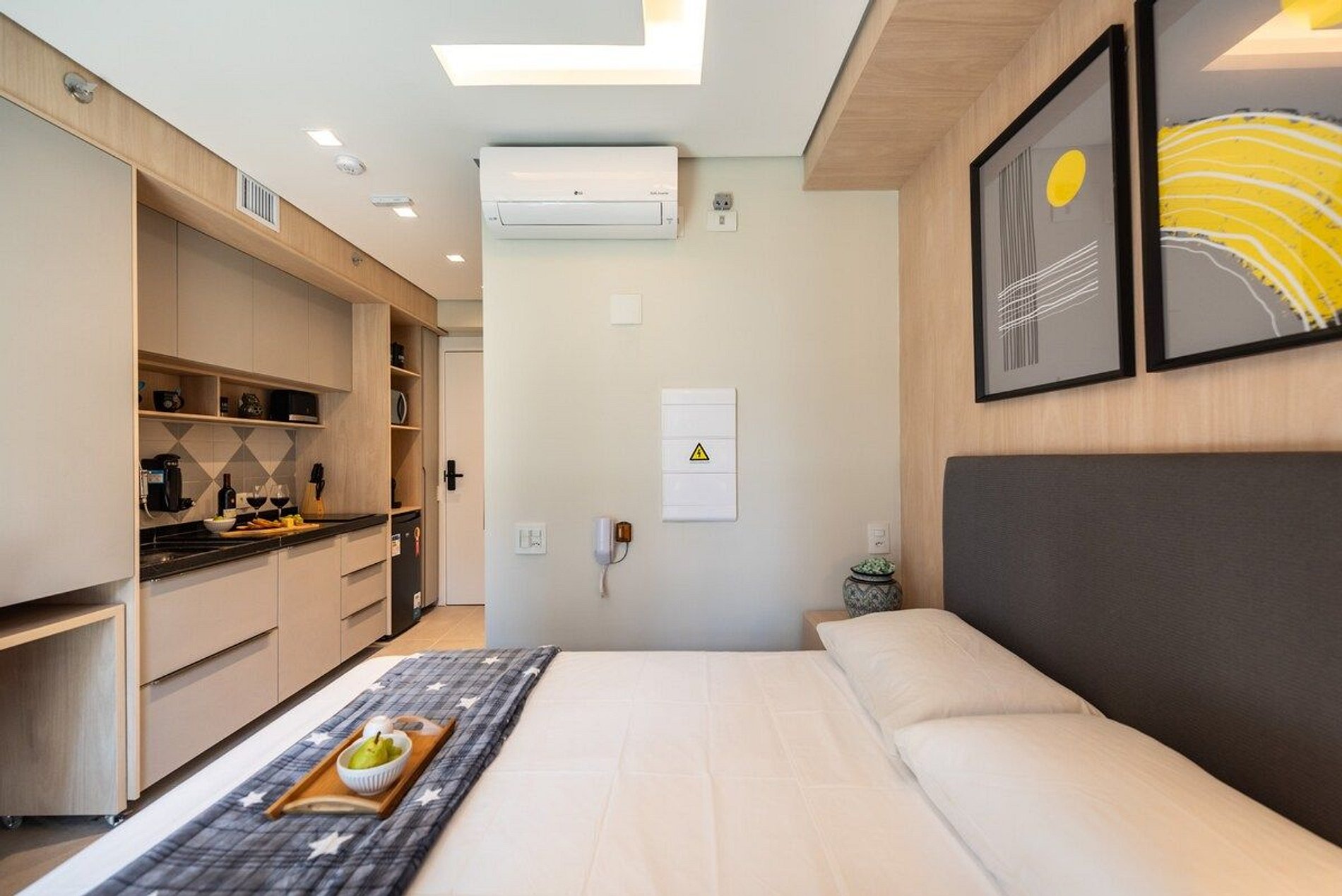 O studio é novo, bem decorado e com produtos de alta qualidade, trazendo conforto e aconchego em sua hospedagem. O prédio está localizado na zona sul de São Paulo, em um dos bairros mais sofisticados da cidade, chamado Moema. Ao redor do bairro é possível conhecer inúmeros restaurantes famosos, festas e o parque Ibirapuera. O edifício é residencial, com portaria 24 horas, coworking, piscina no rooftop e elevador.