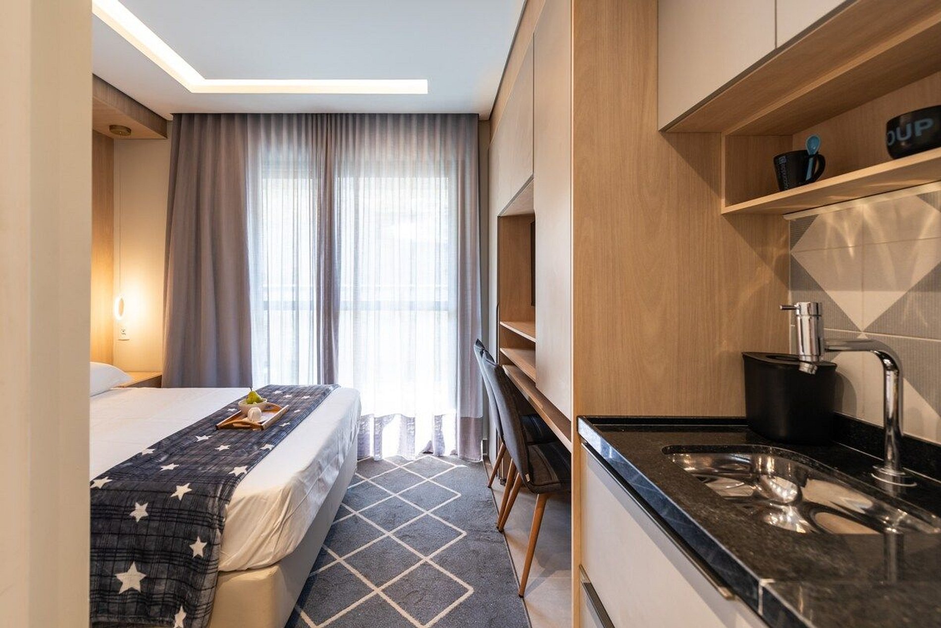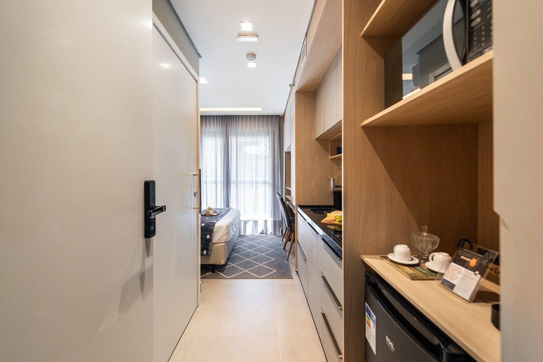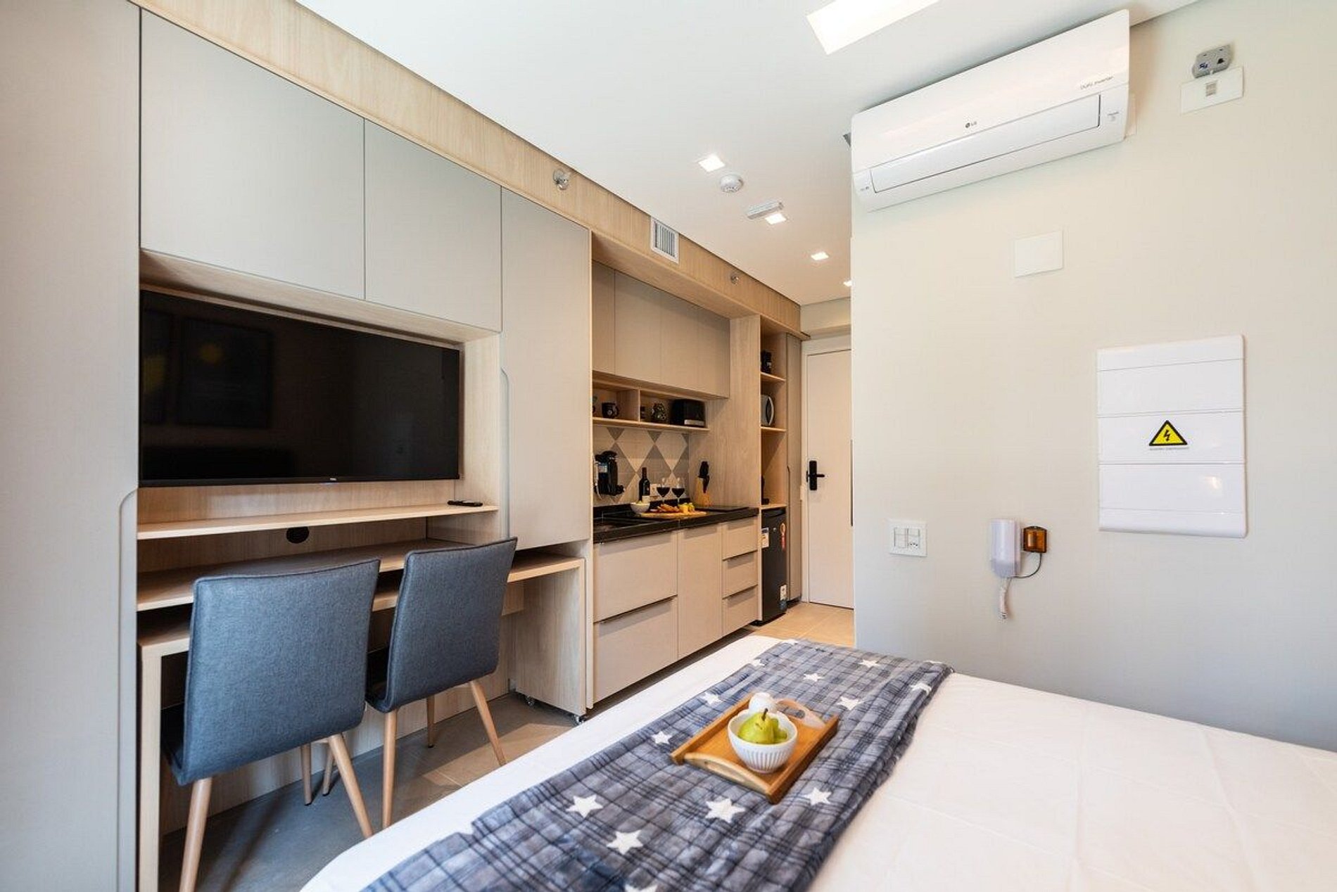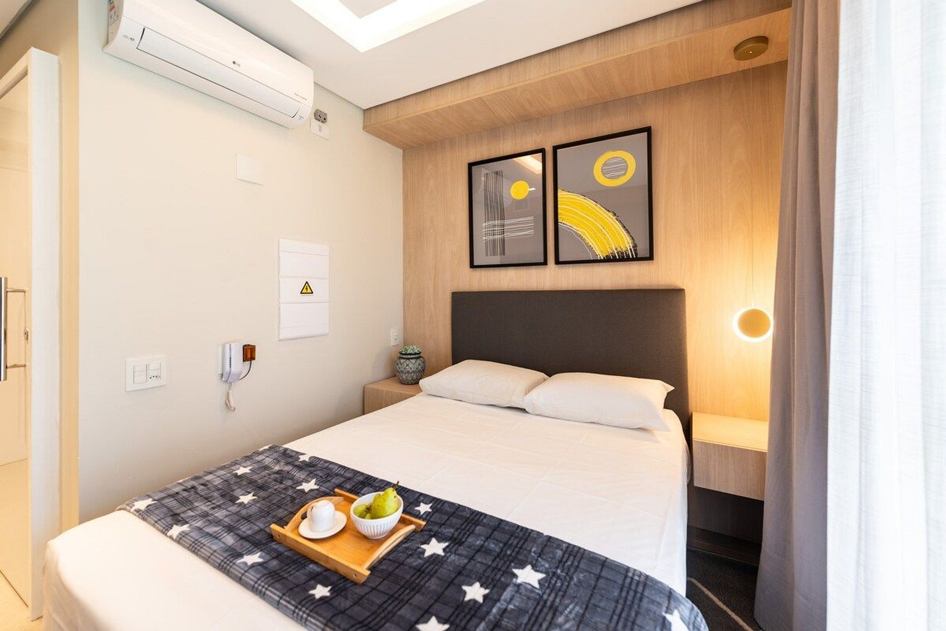 Nosso Loft é compacto, design moderno e bem decorado, tem 22 metros quadrados de área, contém uma cama de casal aconchegante e um chuveiro delicioso. Ideal para quem vem a trabalho ou a passeio. O edifício é lindíssimo e oferece comodidades como: piscina, coworking, academia e lavanderia OMO, facilitando a hospedagem e conforto de nossos hóspedes.