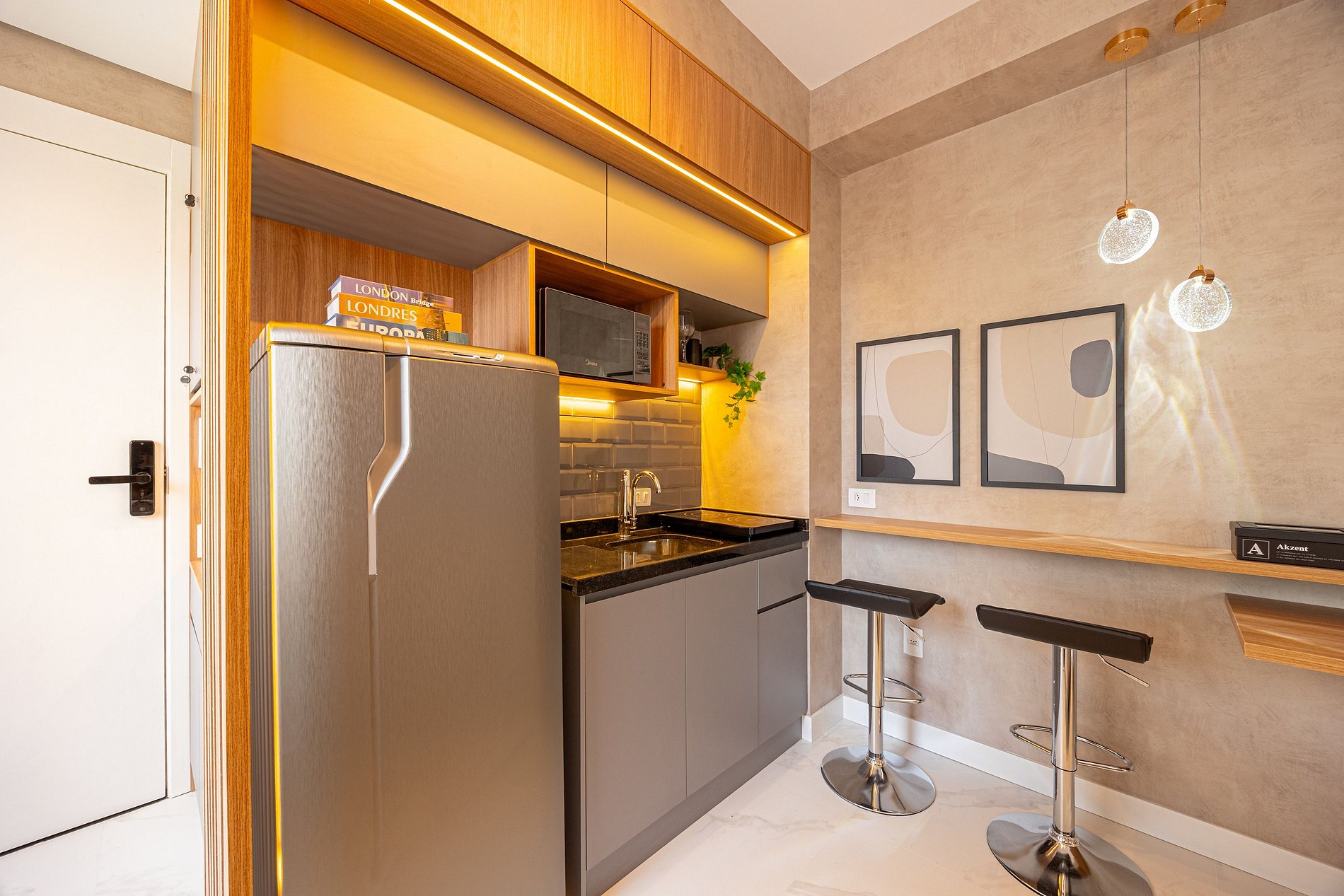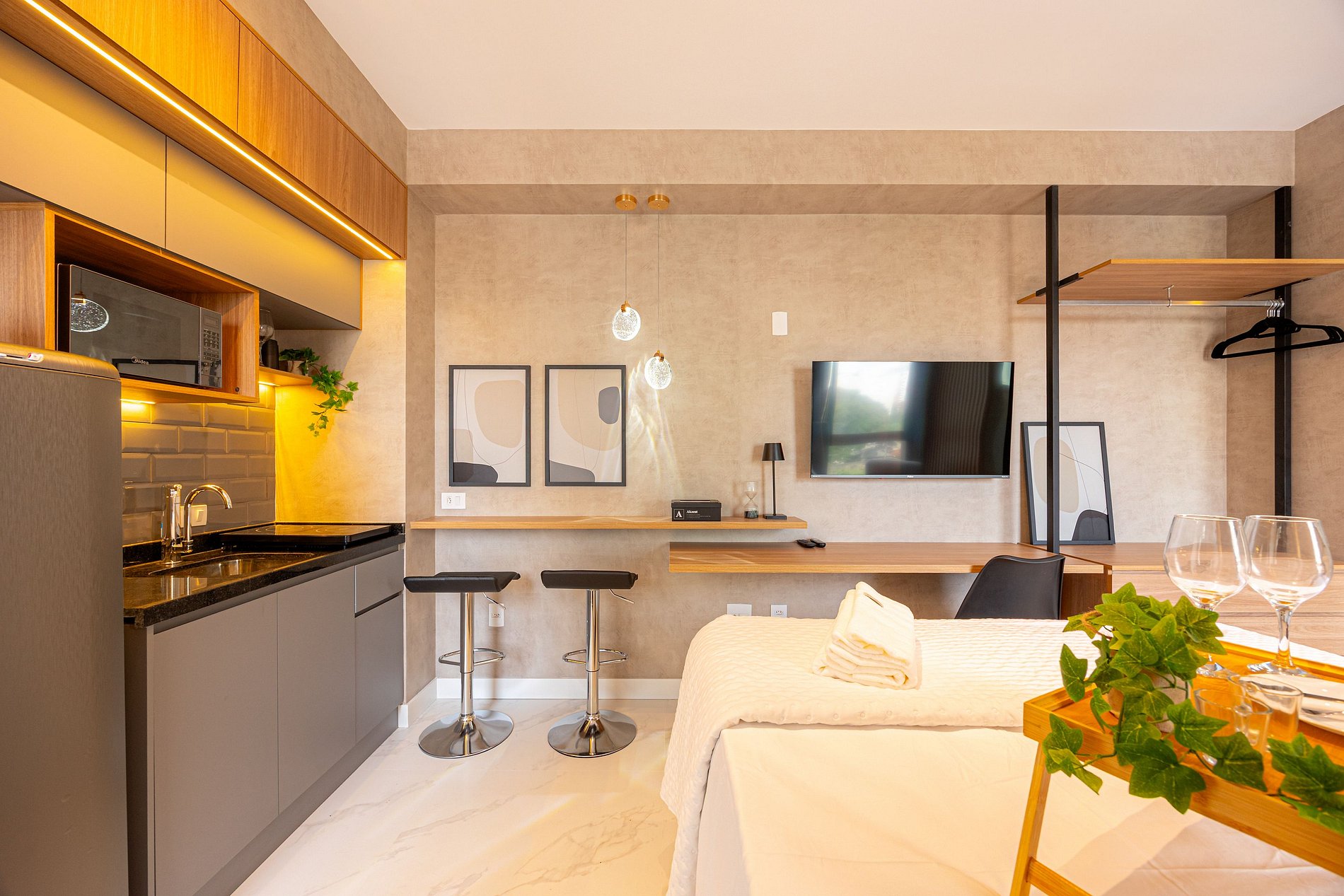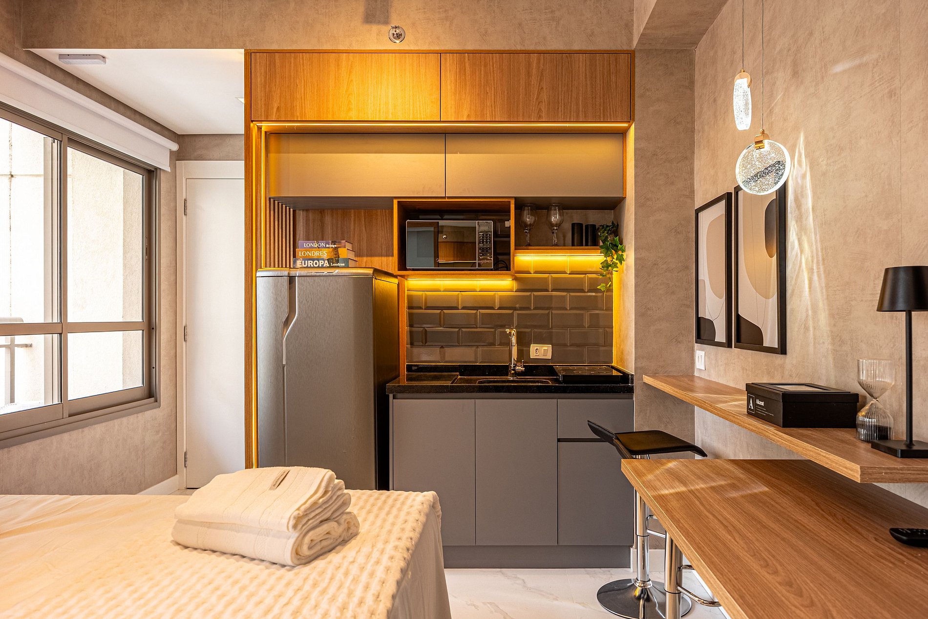 O studio é compacto e ideal para viagens curtas, com praticidade para refeições rápidas. Por estar em uma grande metrópole, é possível ouvir barulhos eventuais de vizinhos, trânsito ou obras. Recomendamos que providencie itens de mercado antes da chegada; há um Mini Pão de Açúcar na rua de trás que pode ser uma ótima opção para suas compras.
