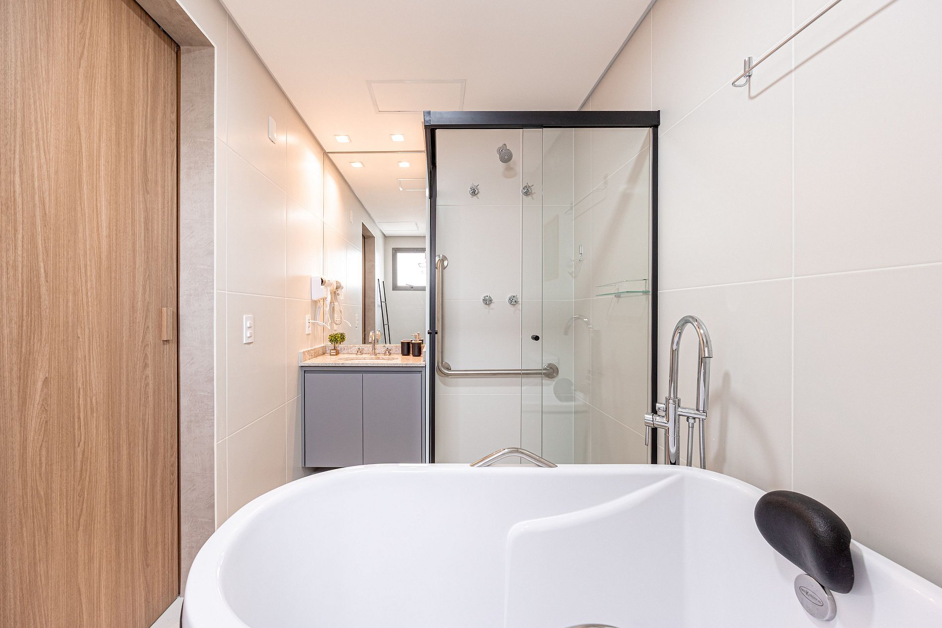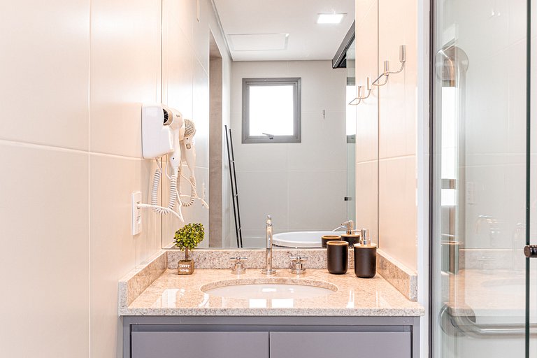 O espaço se destaca pelo design assinado por uma arquiteta talentosa, que combinou elegância e funcionalidade em cada detalhe. A banheira proporciona momentos de relaxamento, e os móveis e itens escolhidos com cuidado garantem conforto e praticidade. Ideal para quem busca um refúgio aconchegante na cidade, com localização estratégica e estrutura completa no edifício.