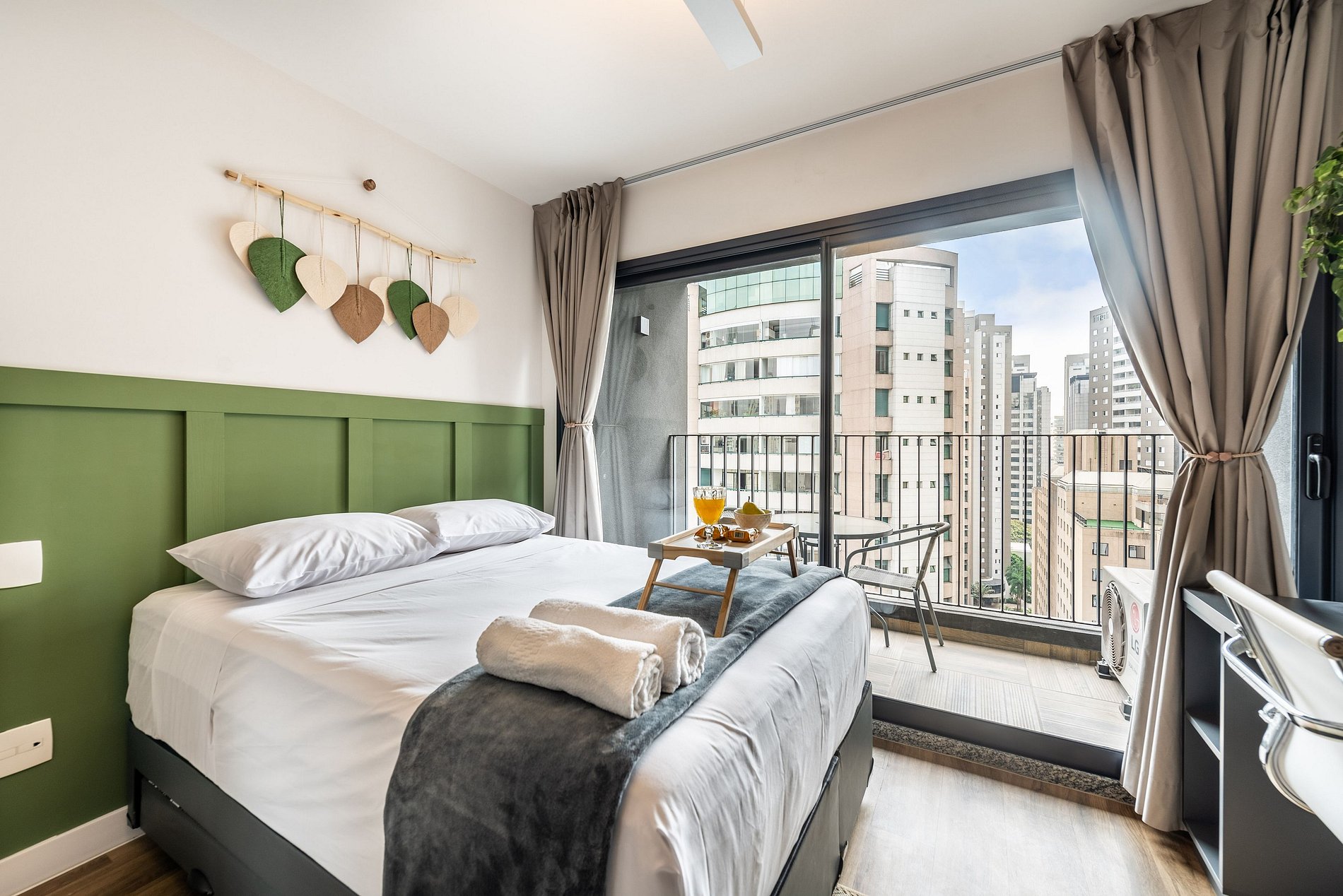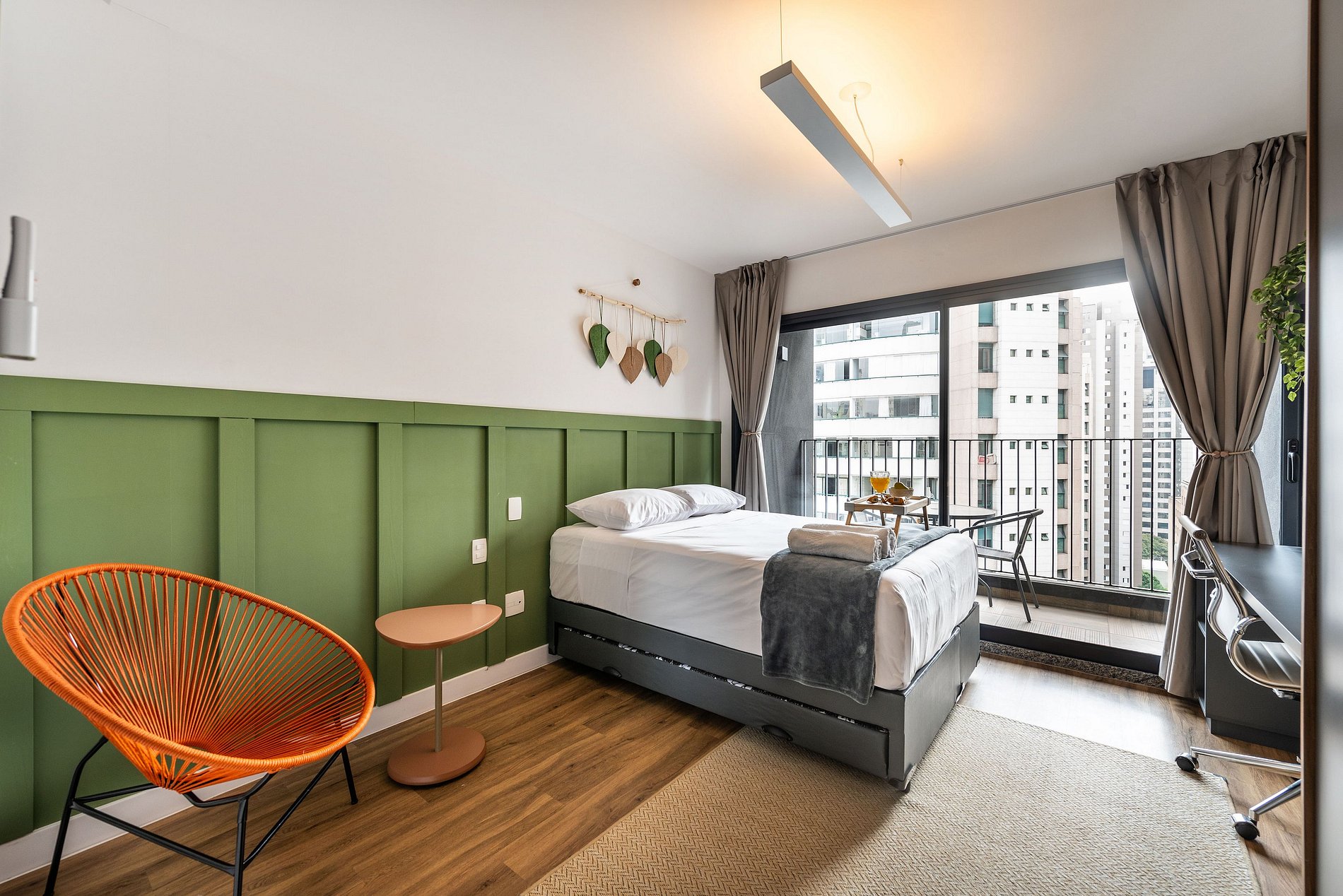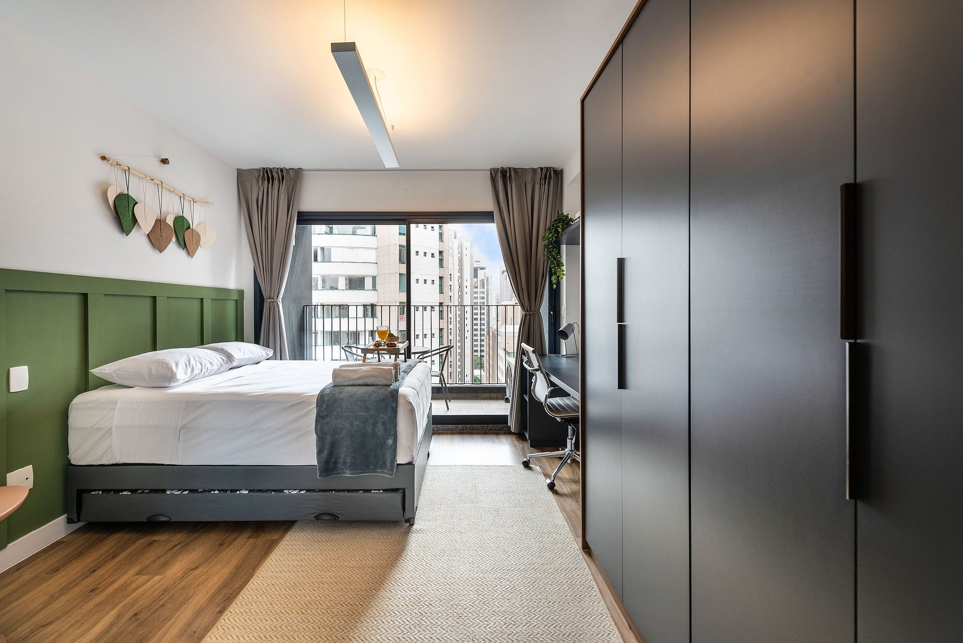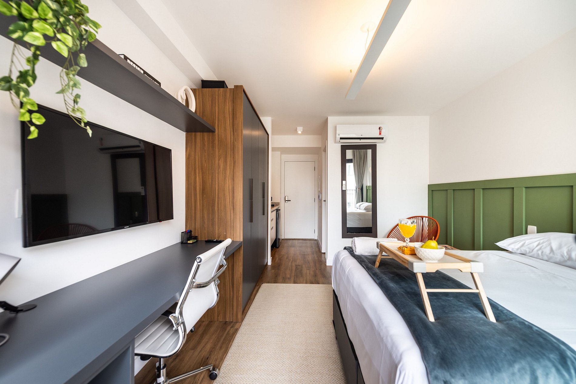 Nosso studio é compacto, design moderno e bem decorado, possui 25 metros quadrados de área, contém uma cama de casal aconchegante, uma cama auxiliar e um chuveiro delicioso. Ideal para quem vem a trabalho ou a passeio. O edifício é lindíssimo e oferece comodidades como: coworking e academia, facilitando a hospedagem e conforto de nossos hóspedes.