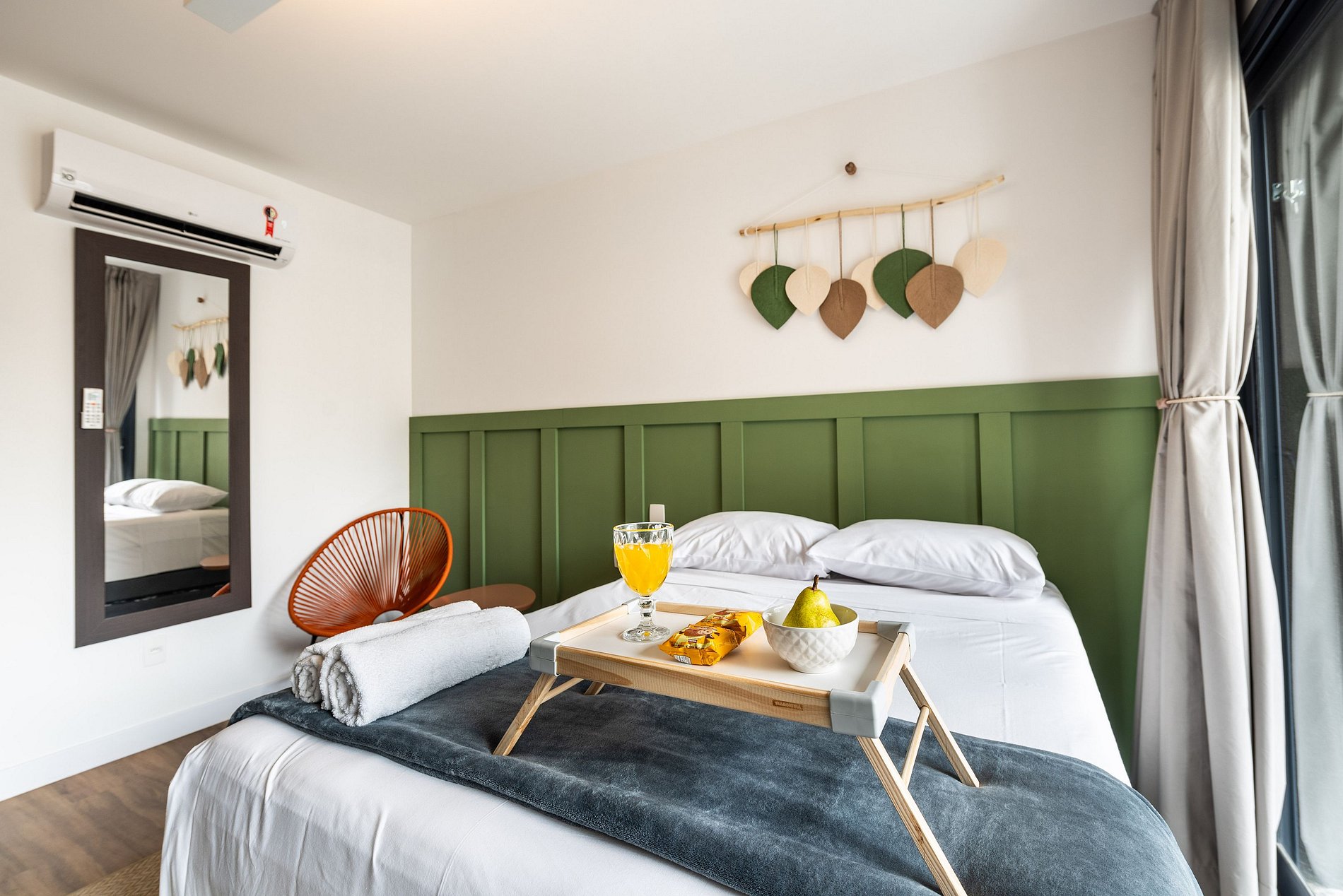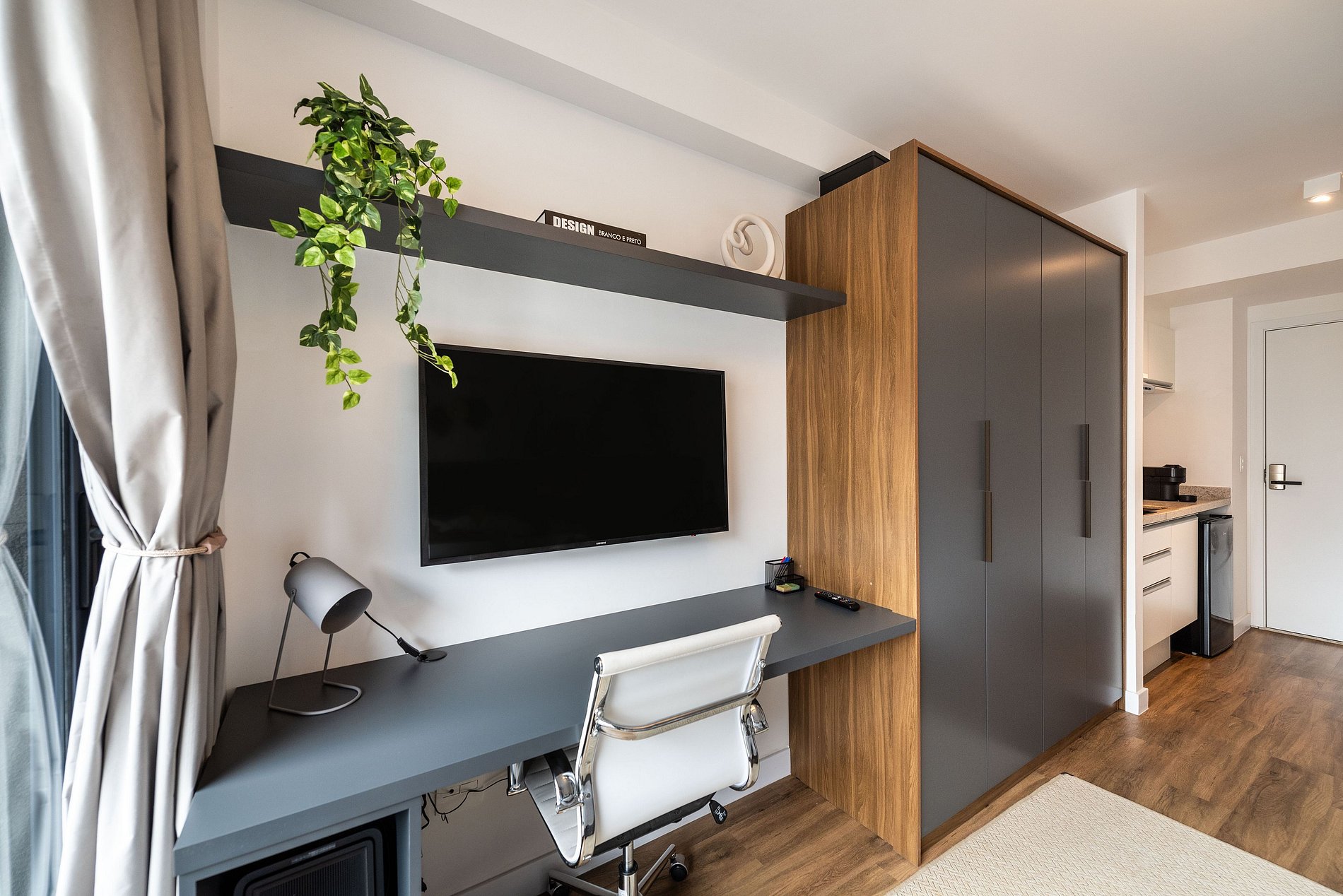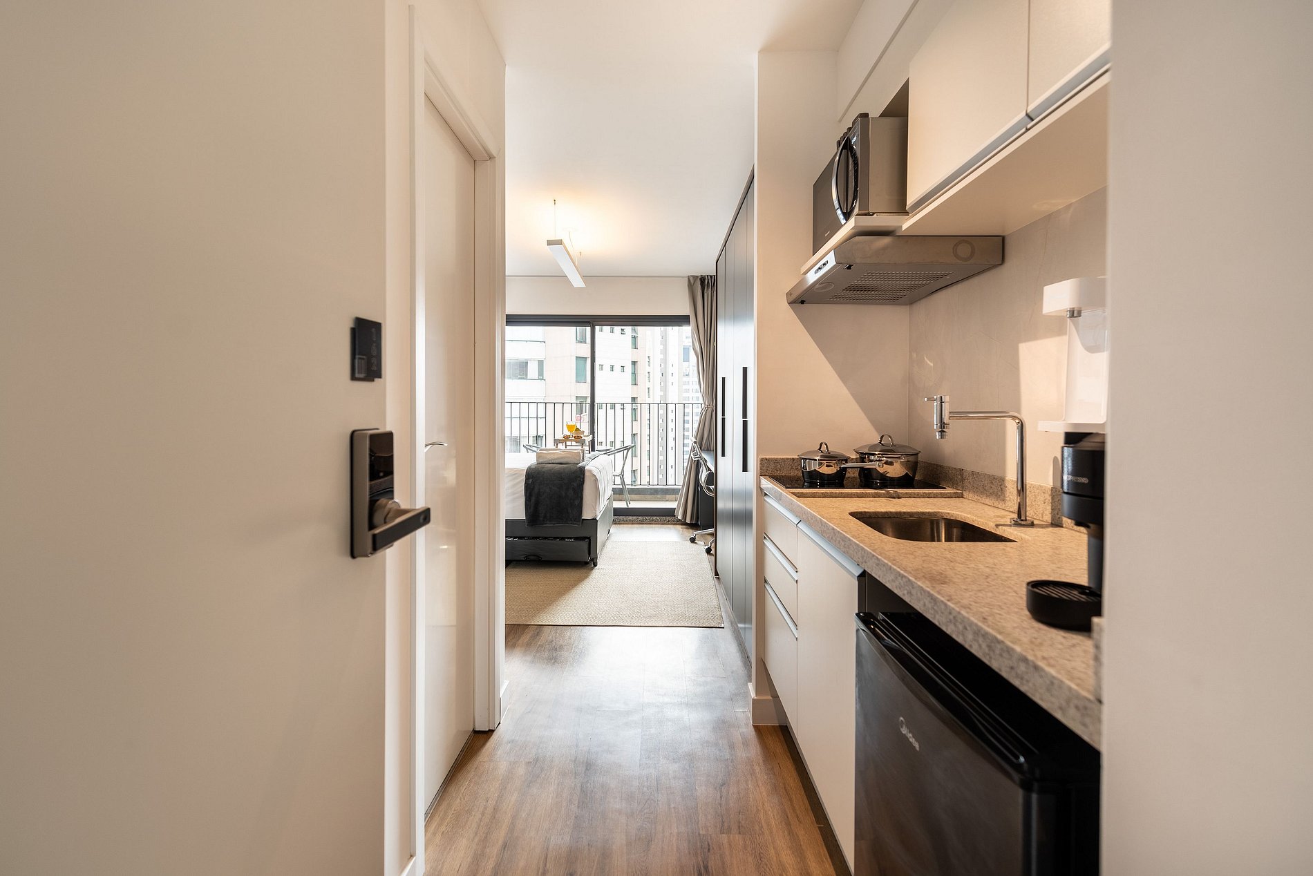 Nosso studio é compacto, design moderno e bem decorado, possui 25 metros quadrados de área, contém uma cama de casal aconchegante, uma cama auxiliar e um chuveiro delicioso. Ideal para quem vem a trabalho ou a passeio. O edifício é lindíssimo e oferece comodidades como: coworking e academia, facilitando a hospedagem e conforto de nossos hóspedes.