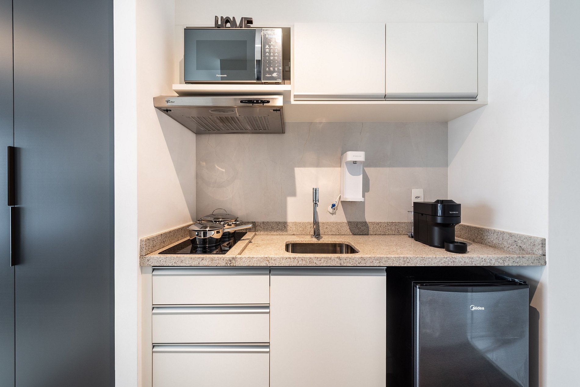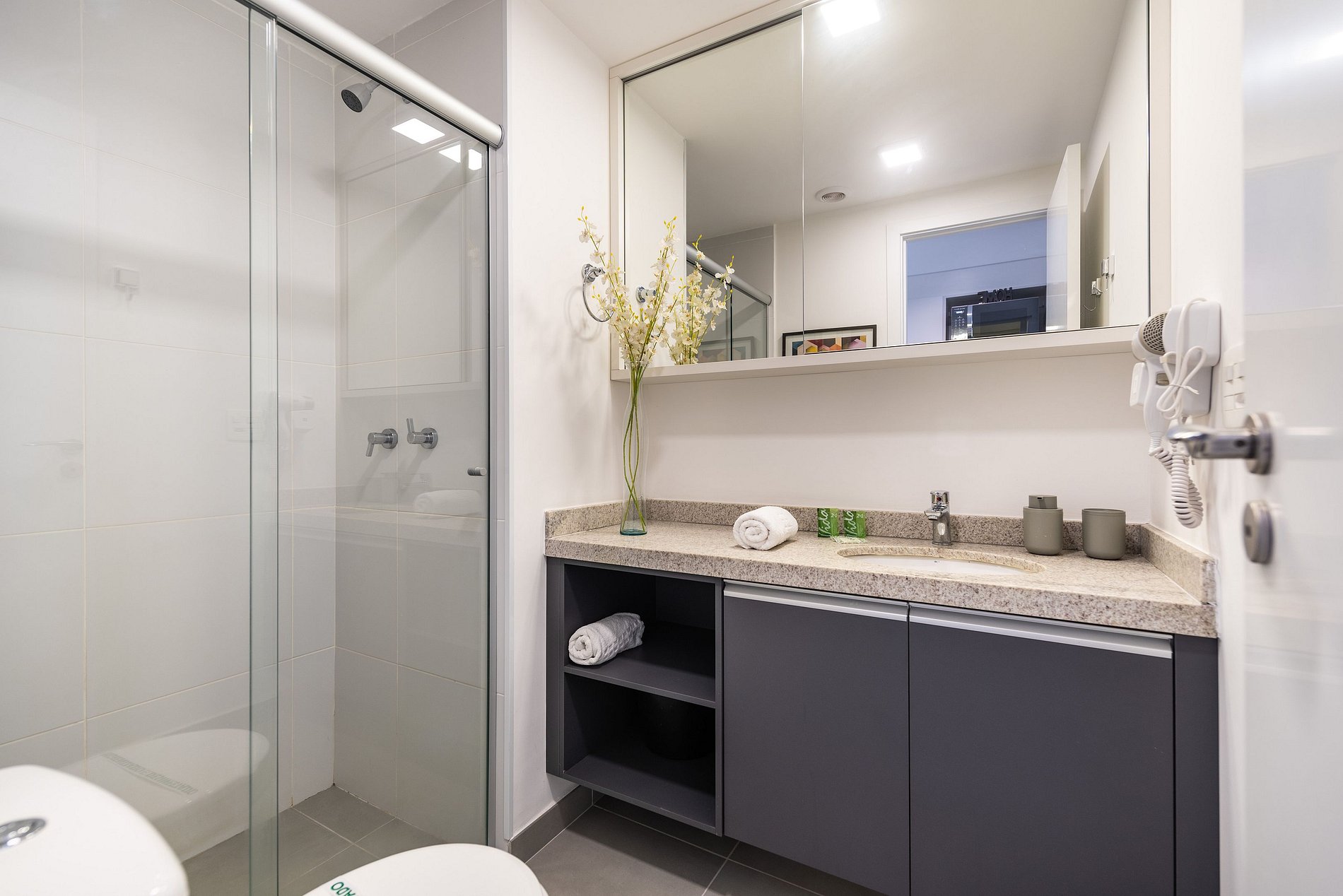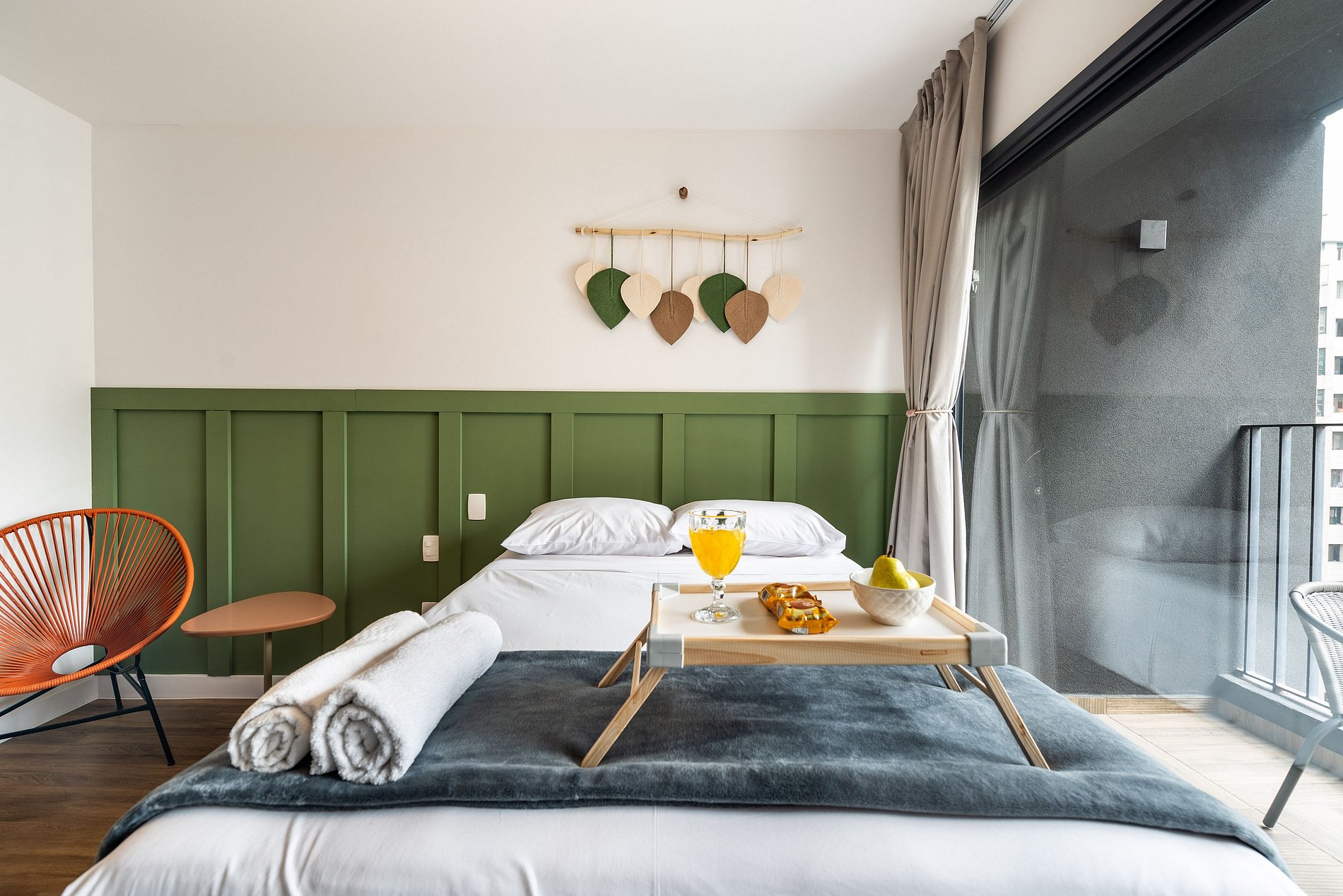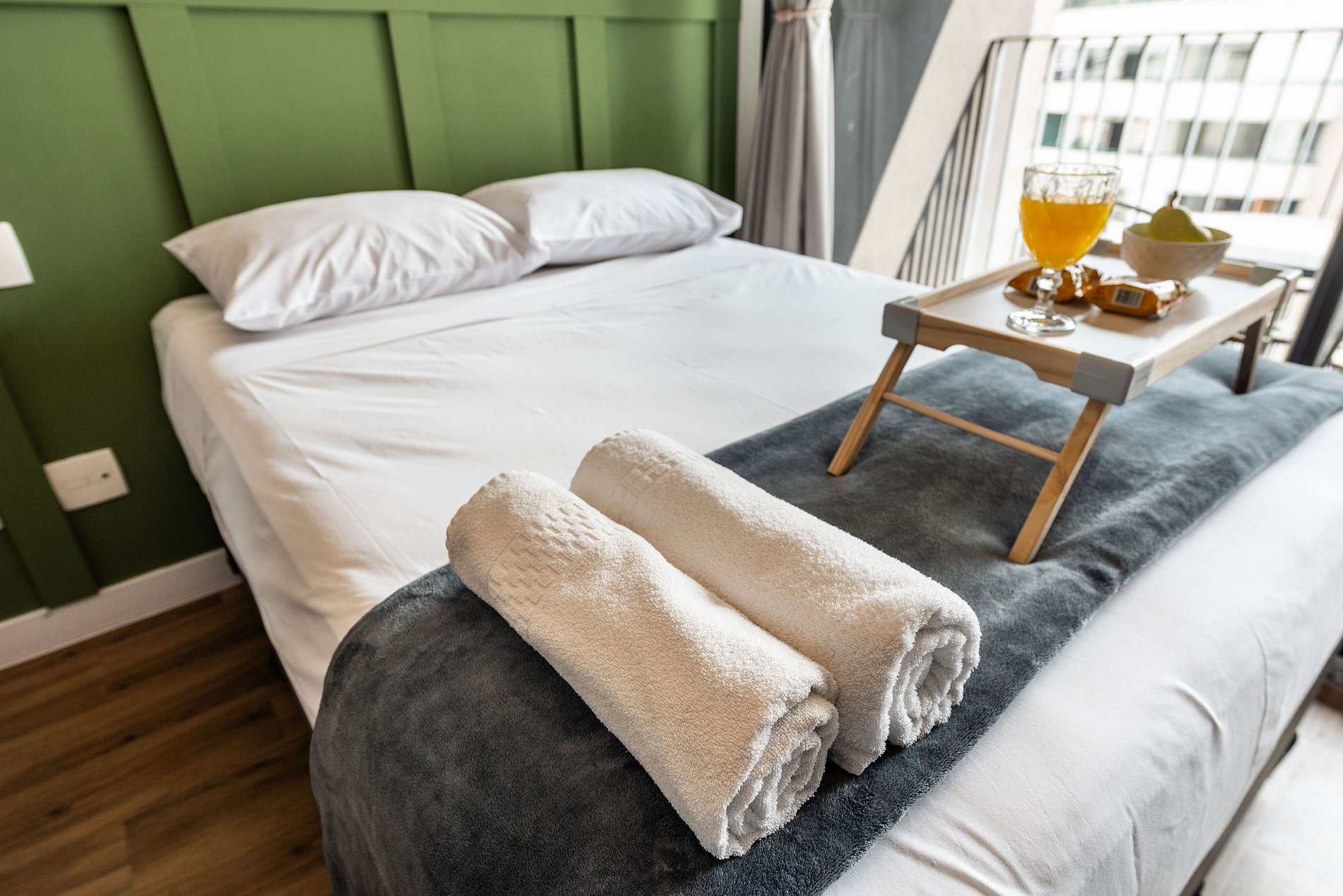 Nosso studio é compacto, design moderno e bem decorado, possui 25 metros quadrados de área, contém uma cama de casal aconchegante, uma cama auxiliar e um chuveiro delicioso. Ideal para quem vem a trabalho ou a passeio. O edifício é lindíssimo e oferece comodidades como: coworking e academia, facilitando a hospedagem e conforto de nossos hóspedes.