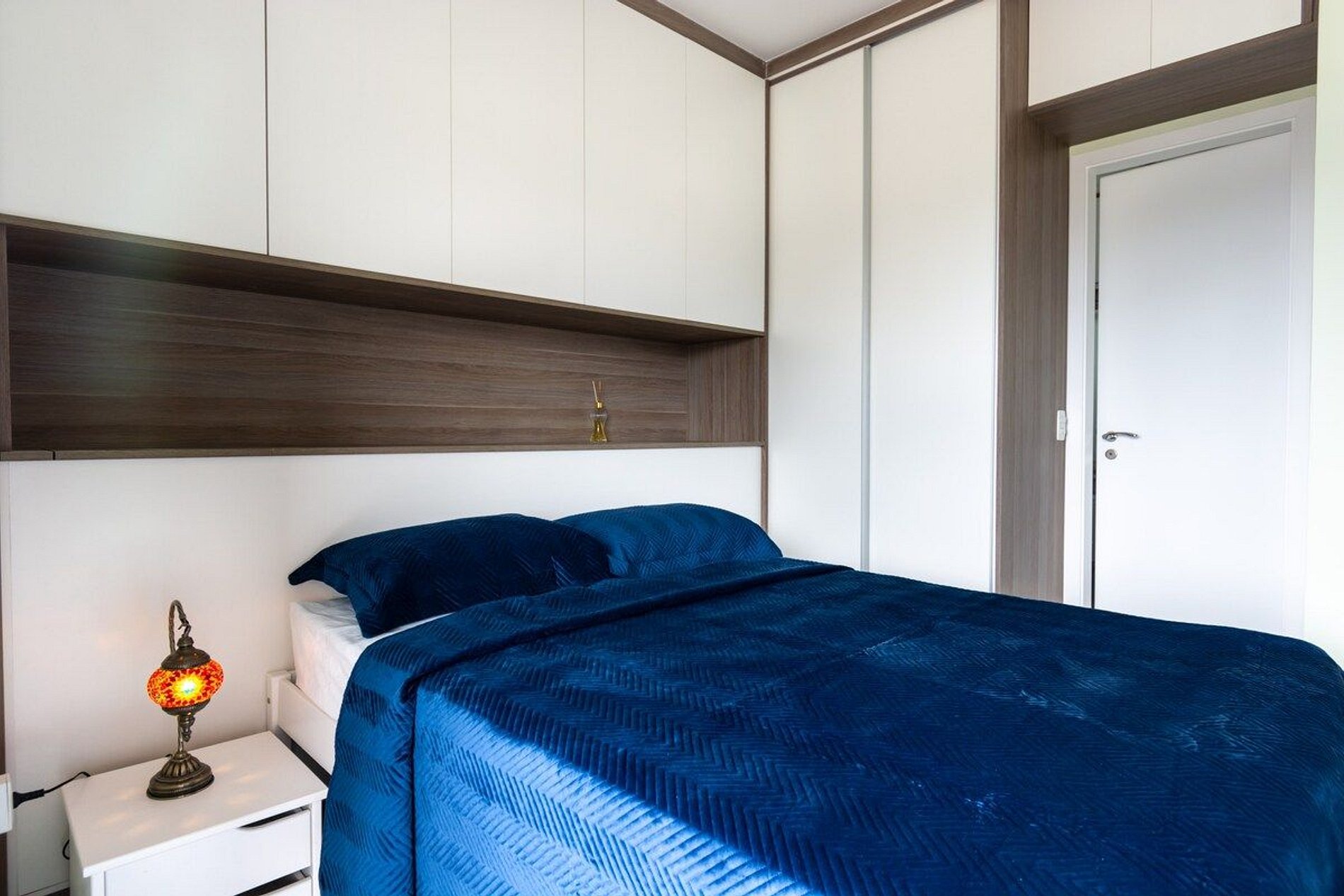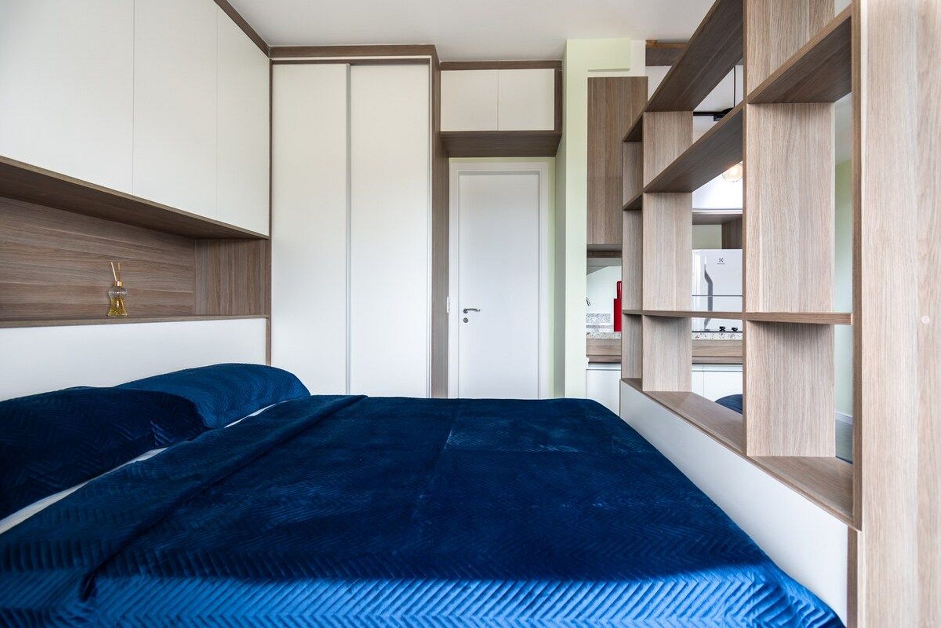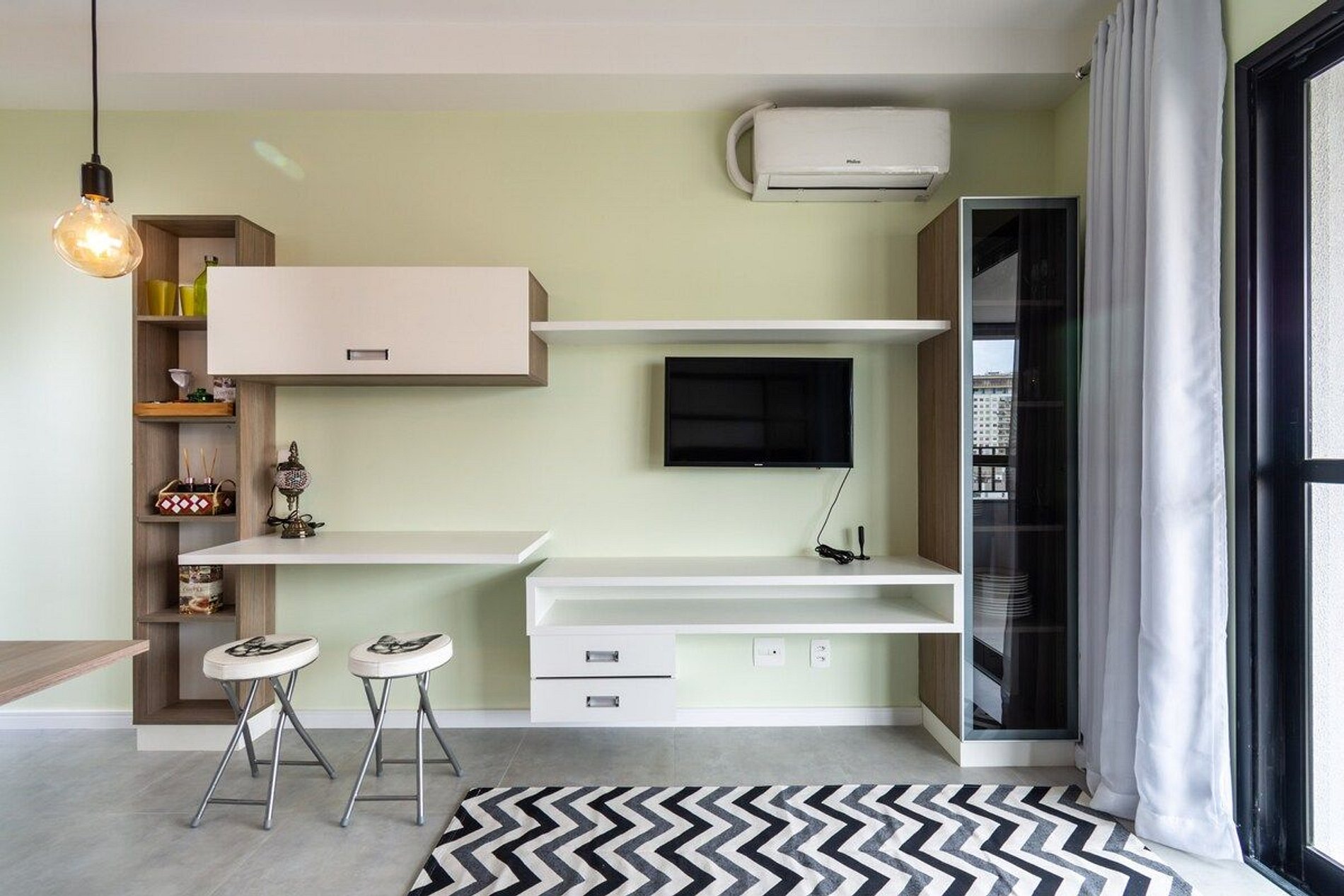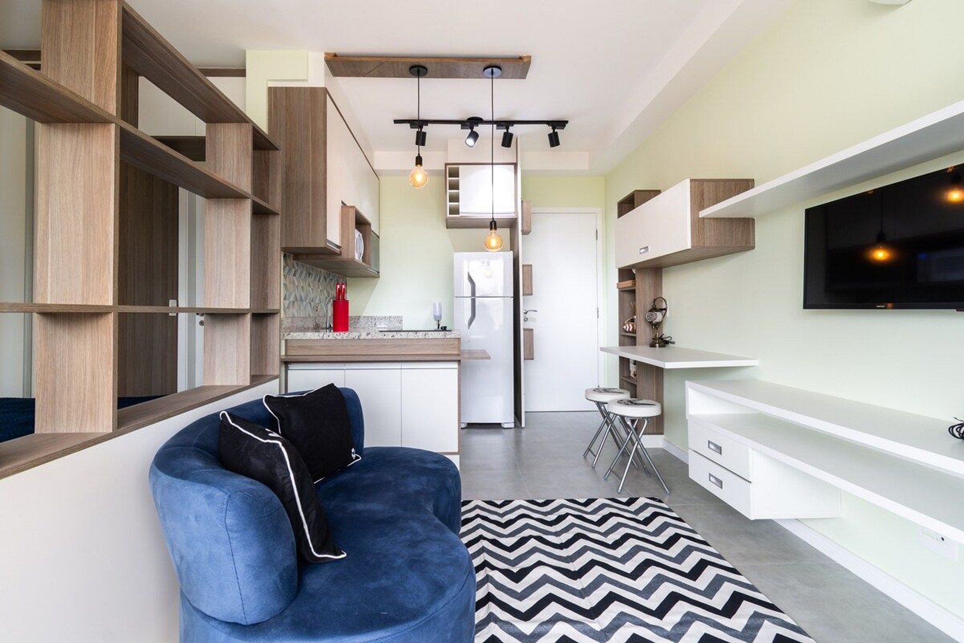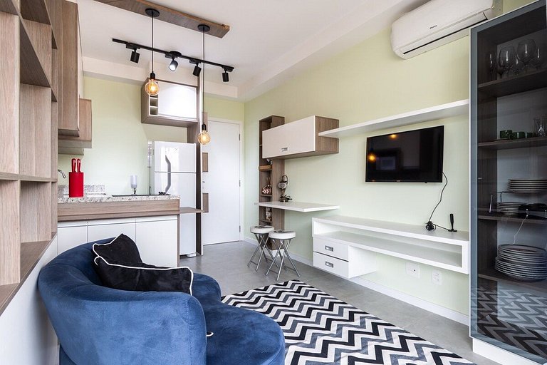 O espaço é compacto e funcional, encanta pela beleza e praticidade. Temos cooktop, forninho, ar condicionado e vista para a cidade, que a noite é lindo.