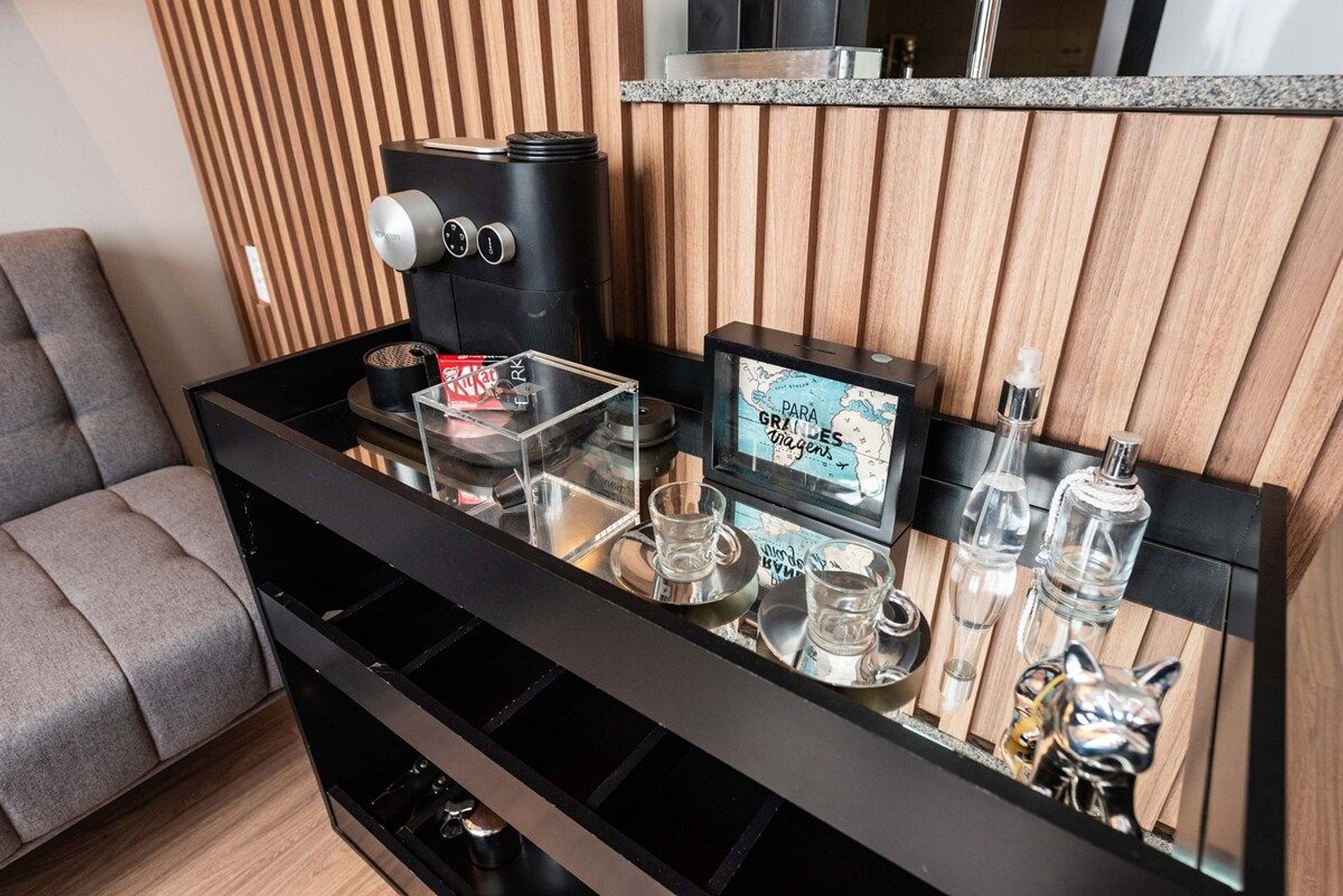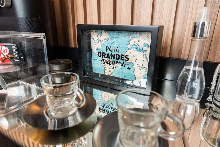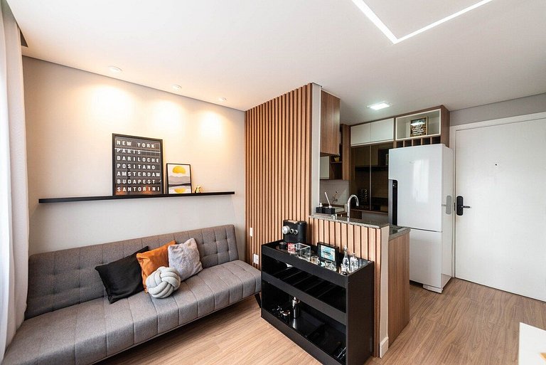 O espaço é projetado para ser acolhedor e funcional, com Wi-Fi gratuito, cozinha compacta bem equipada e fechadura eletrônica. A decoração moderna e as comodidades do prédio, como a piscina e a academia, oferecem conforto e conveniência, fazendo os hóspedes se sentirem em casa.