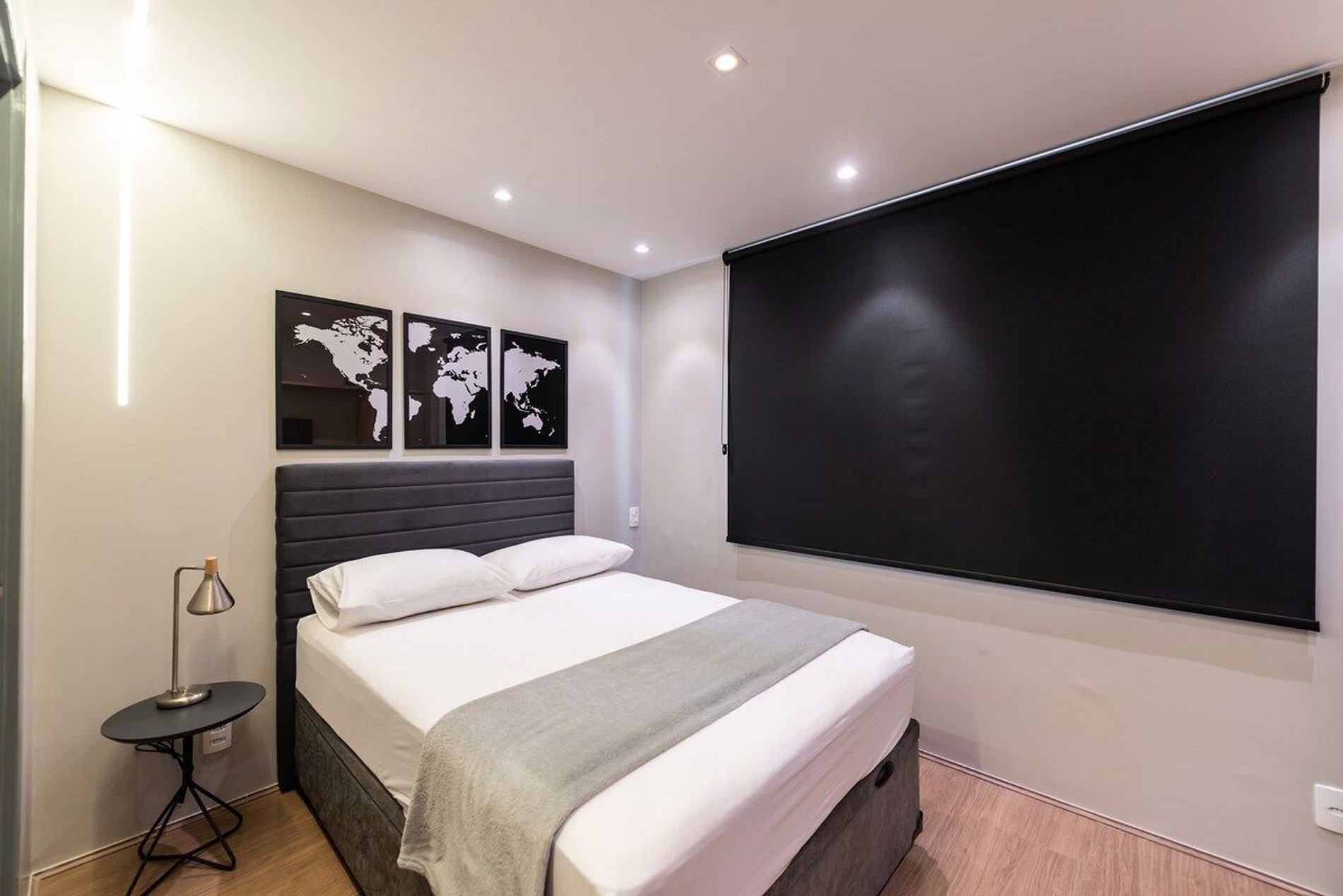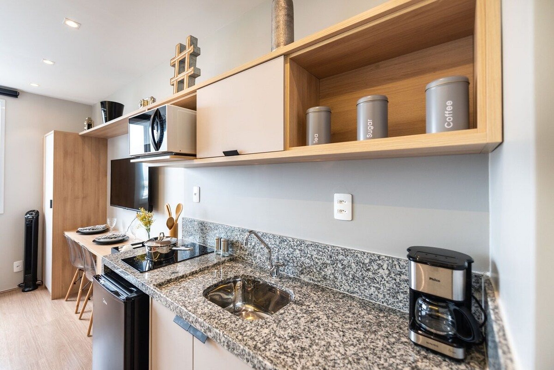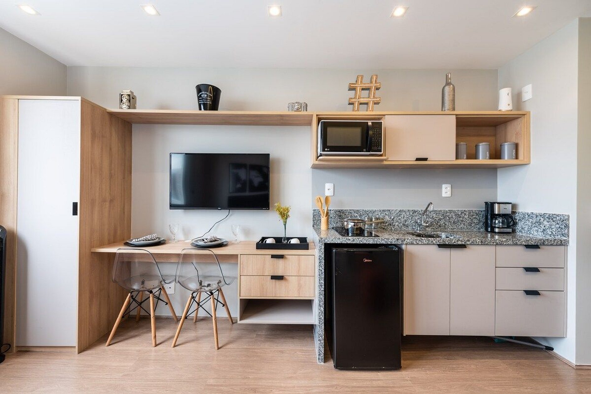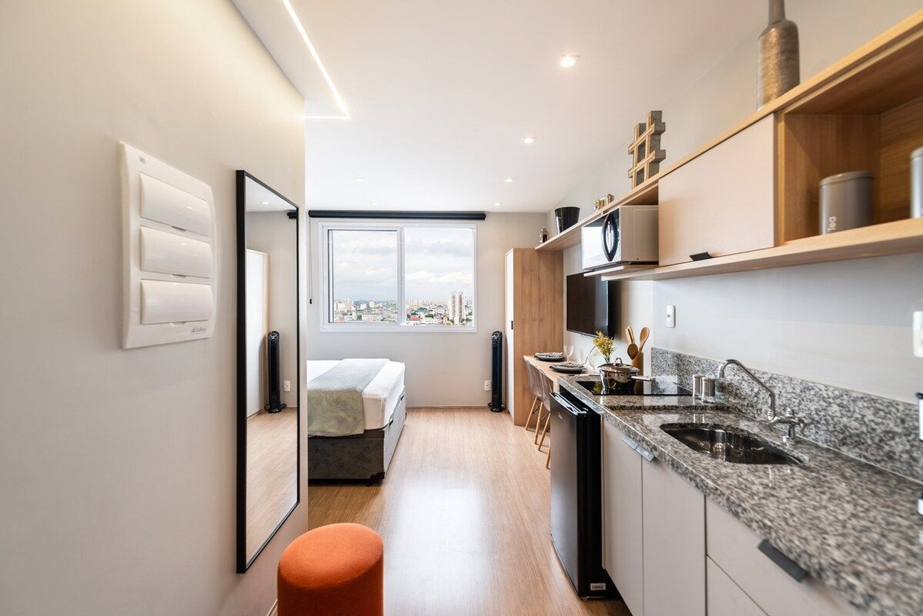 O studio fica em um prédio novo, construído em 2020, possui 18m2 e uma decoração minimalista e contemporânea. Seu andar é alto e possui uma vista legal do bairro e da cidade.