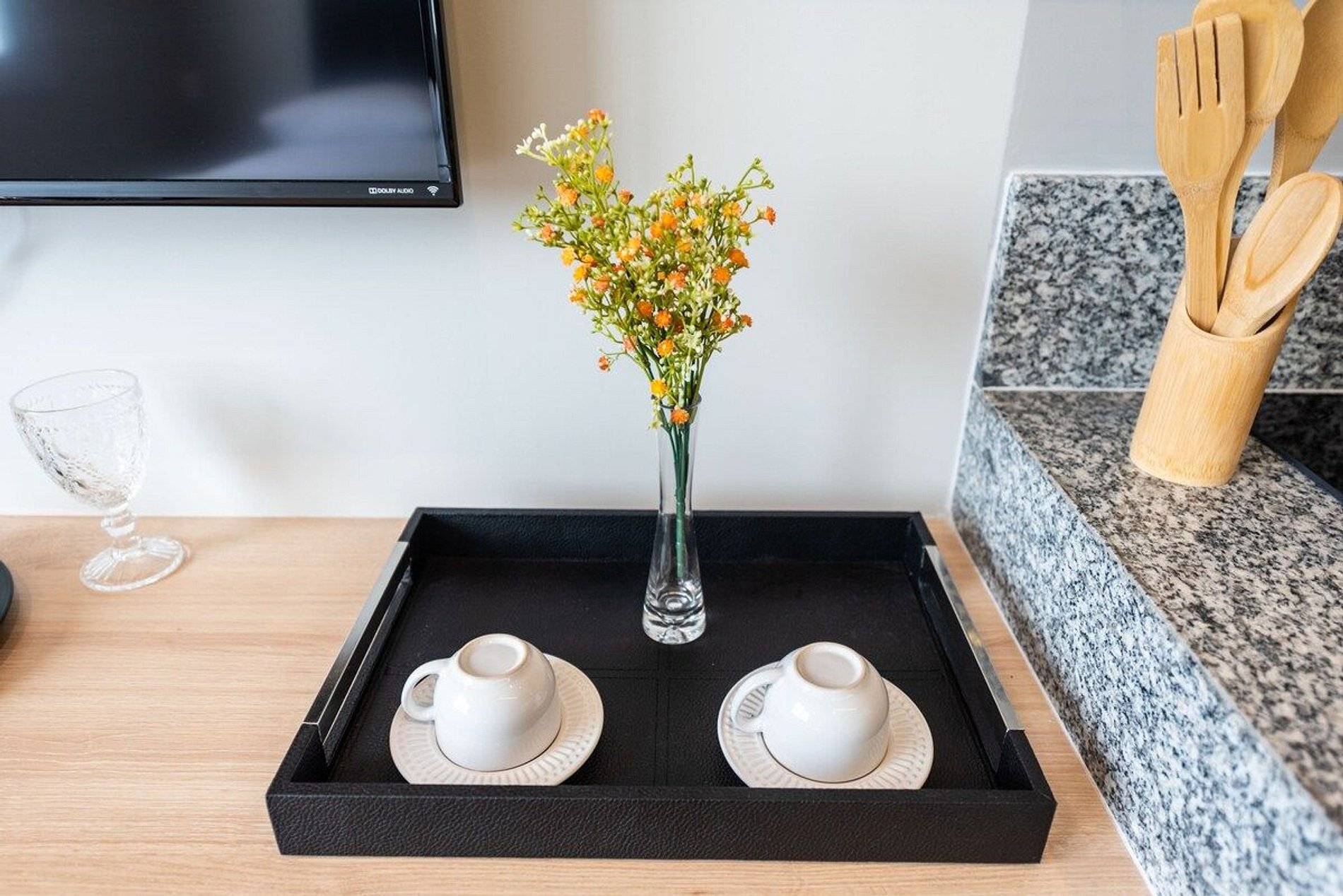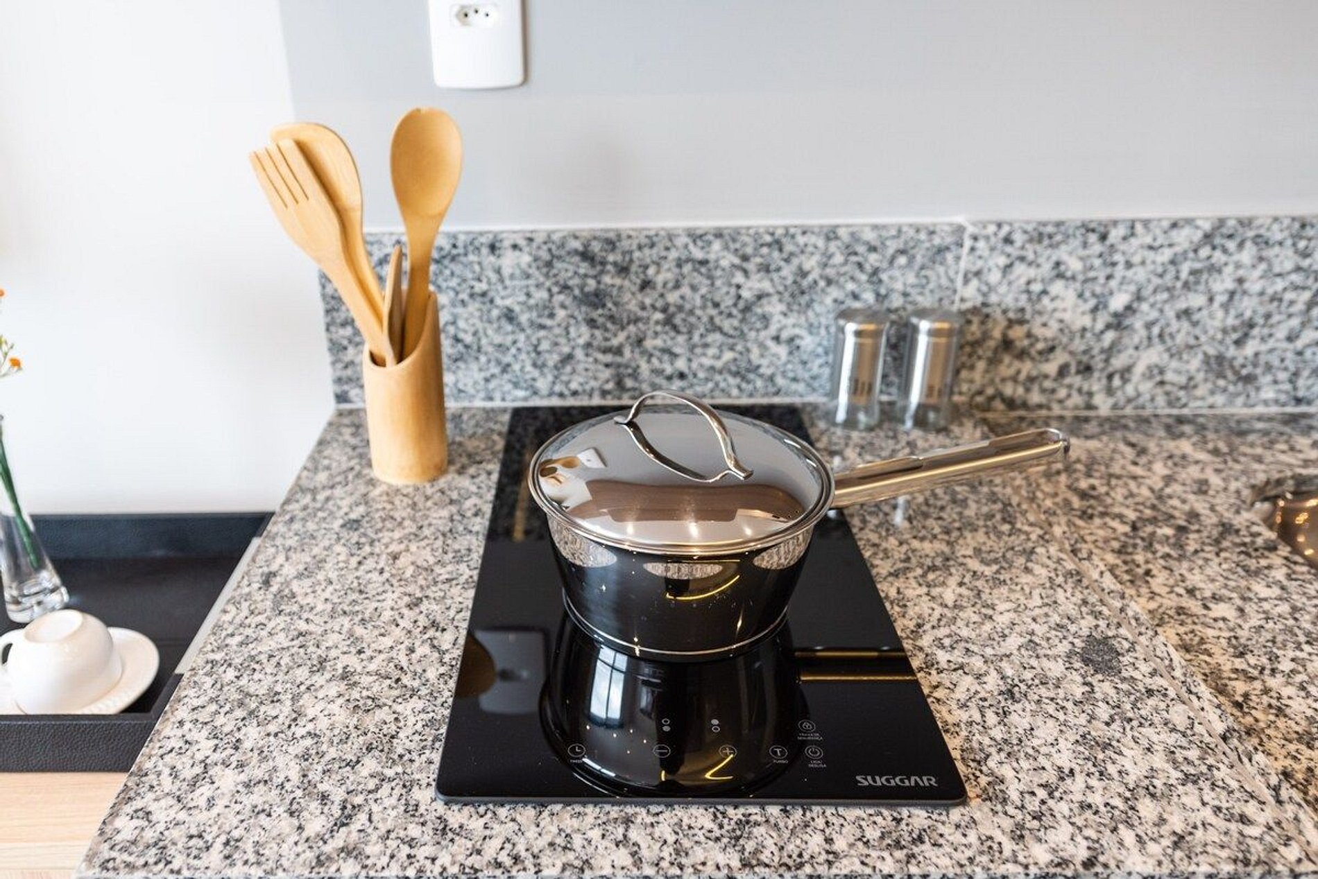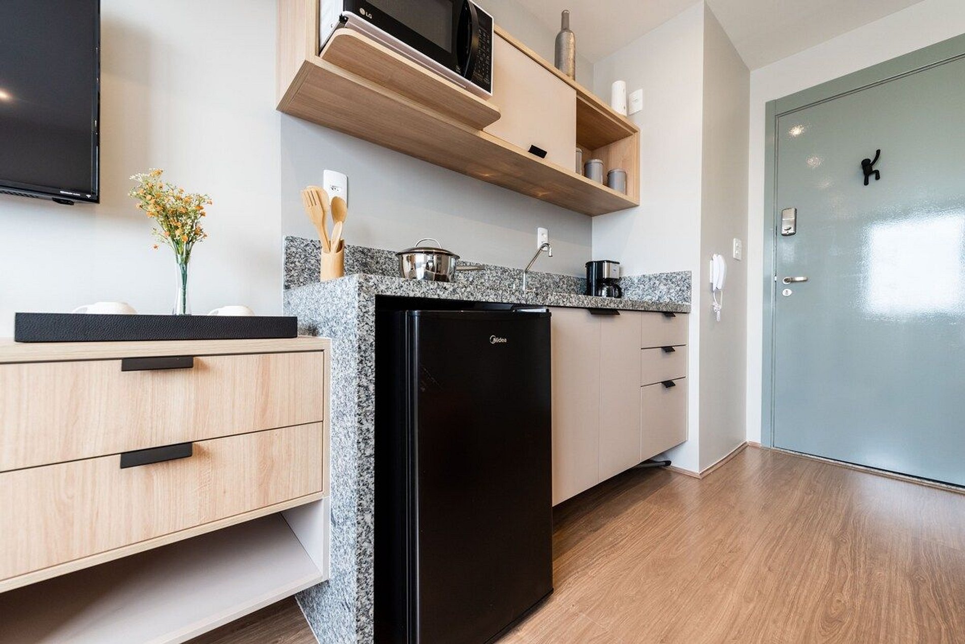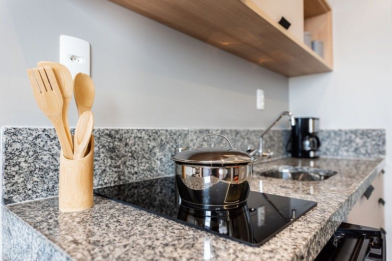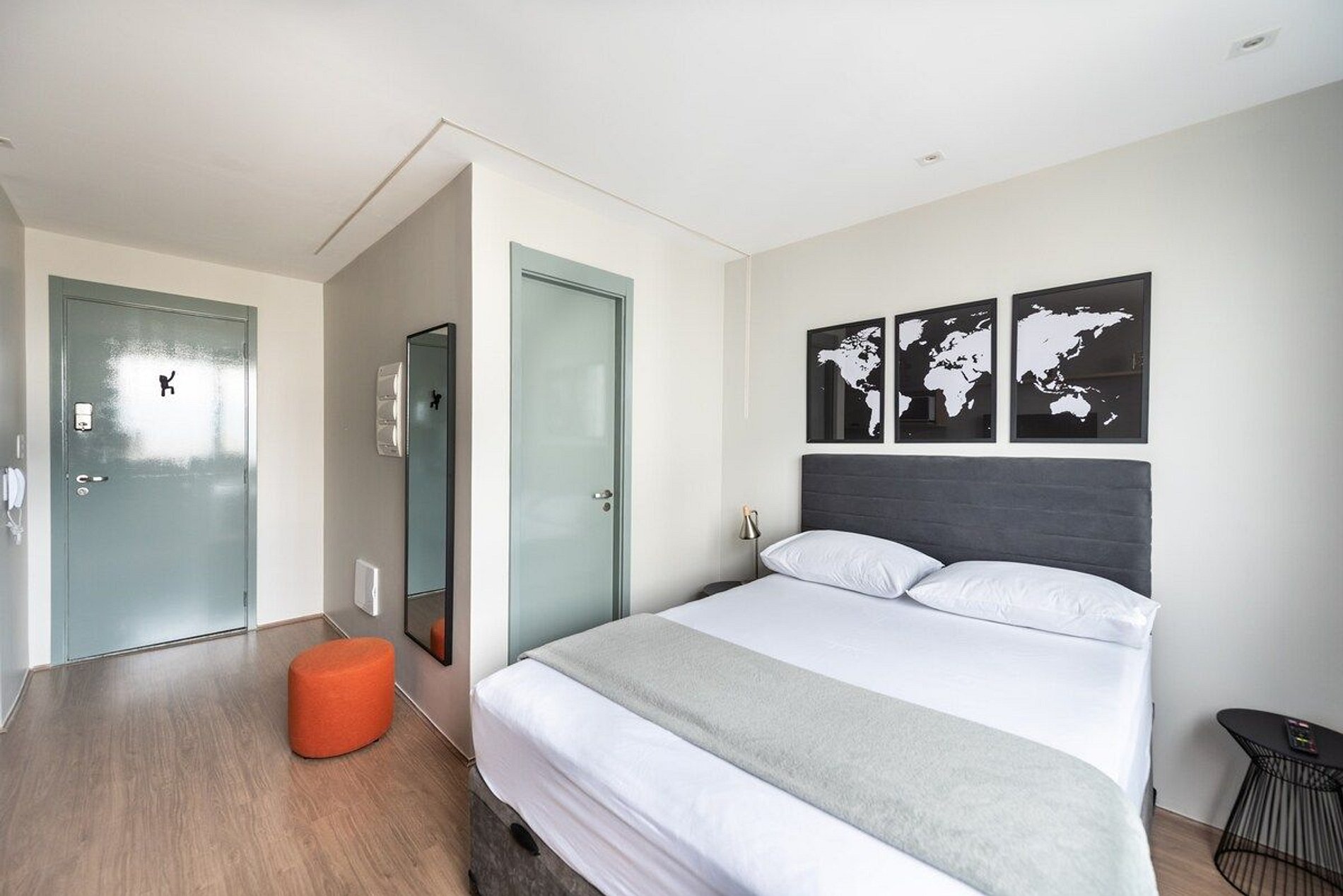 O studio fica em um prédio novo, construído em 2020, possui 18m2 e uma decoração minimalista e contemporânea. Seu andar é alto e possui uma vista legal do bairro e da cidade.