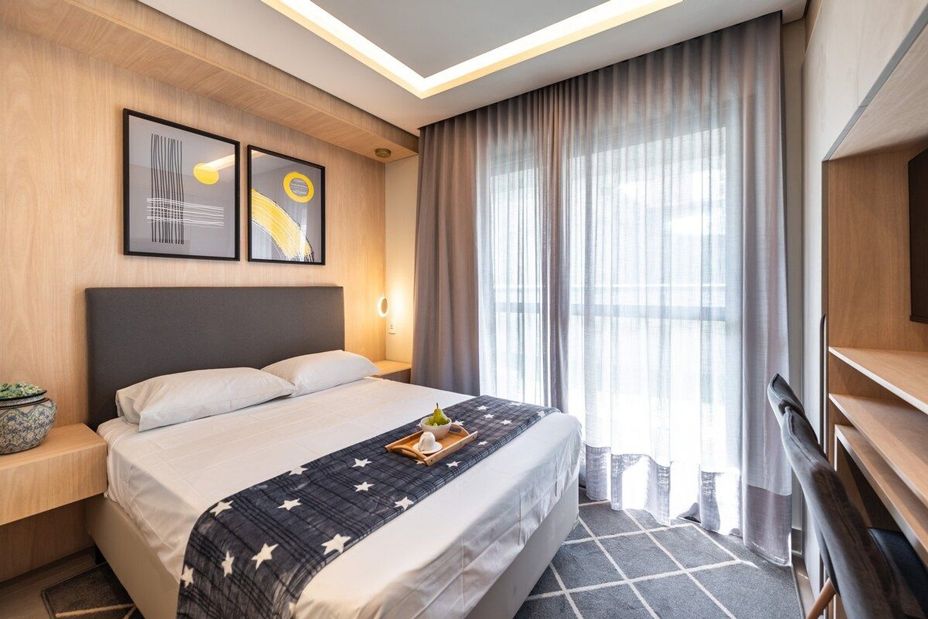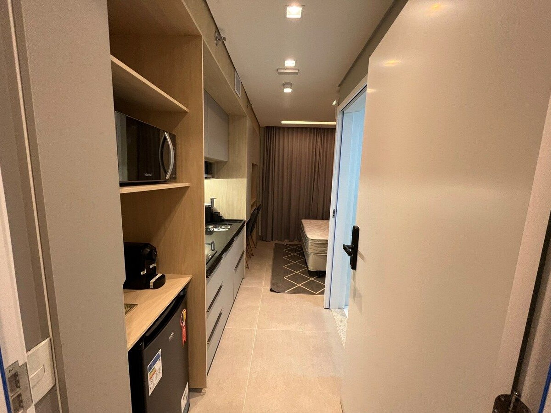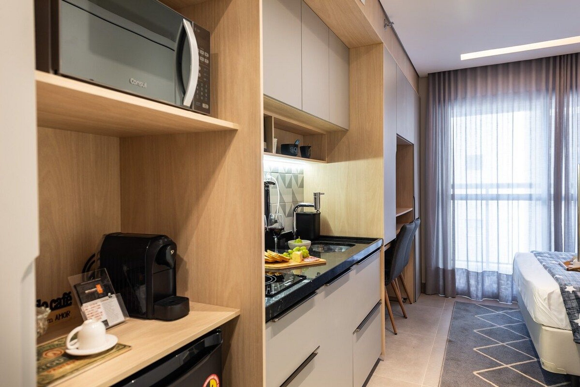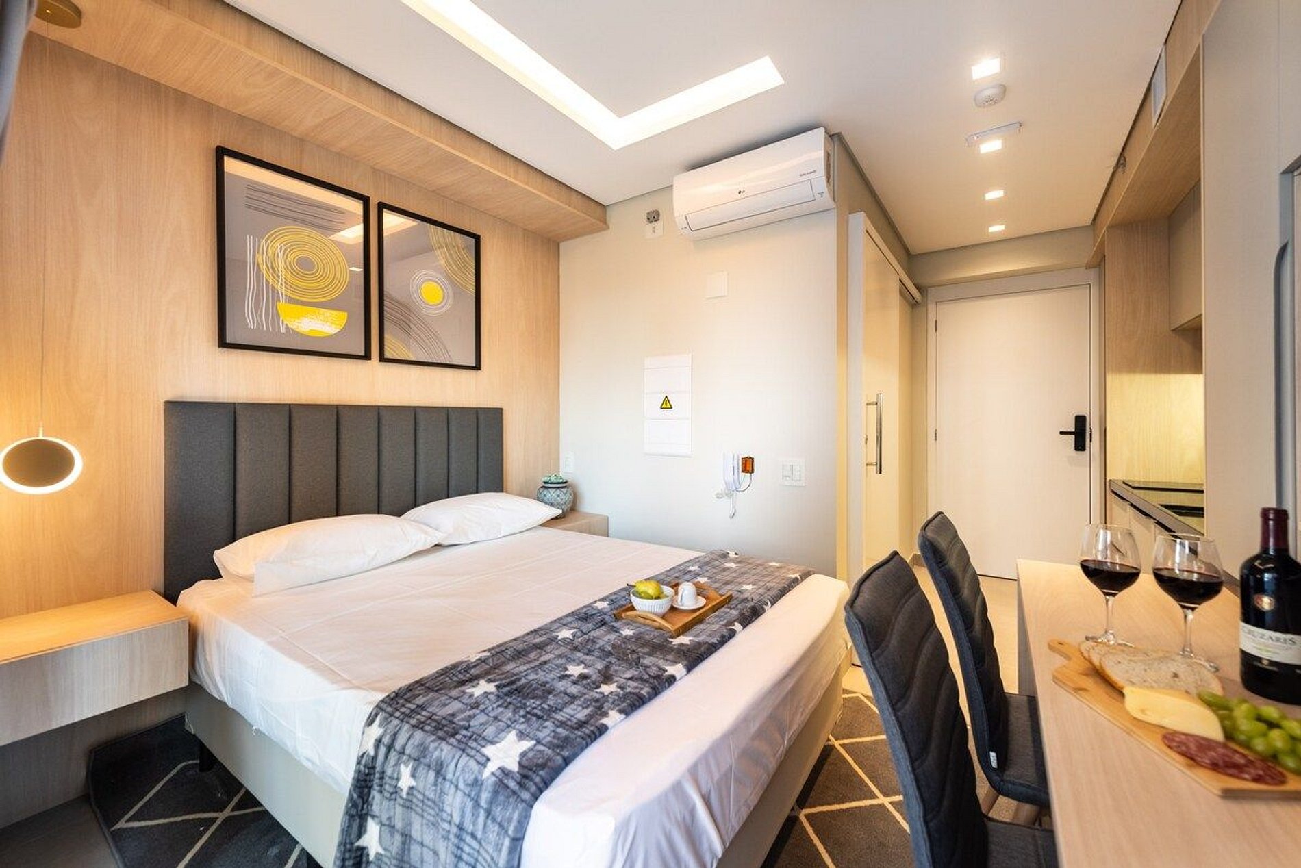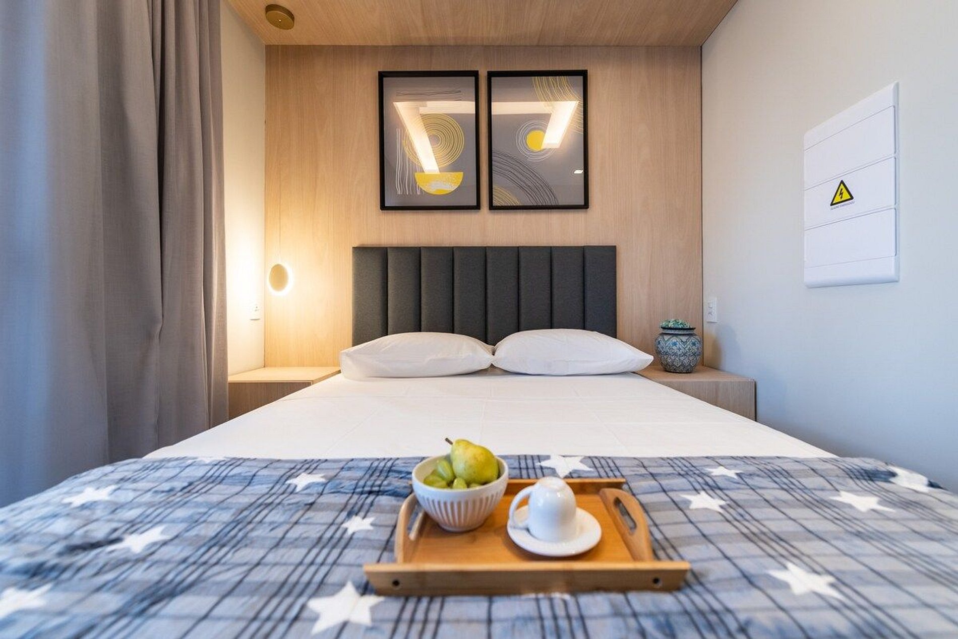 Nosso Loft é compacto, design moderno e bem decorado, tem 22 metros quadrados de área, contém uma cama de casal aconchegante e um chuveiro delicioso. Ideal para quem vem a trabalho ou a passeio. O edifício é lindíssimo e oferece comodidades como: piscina, coworking, academia e lavanderia OMO, facilitando a hospedagem e conforto de nossos hóspedes.