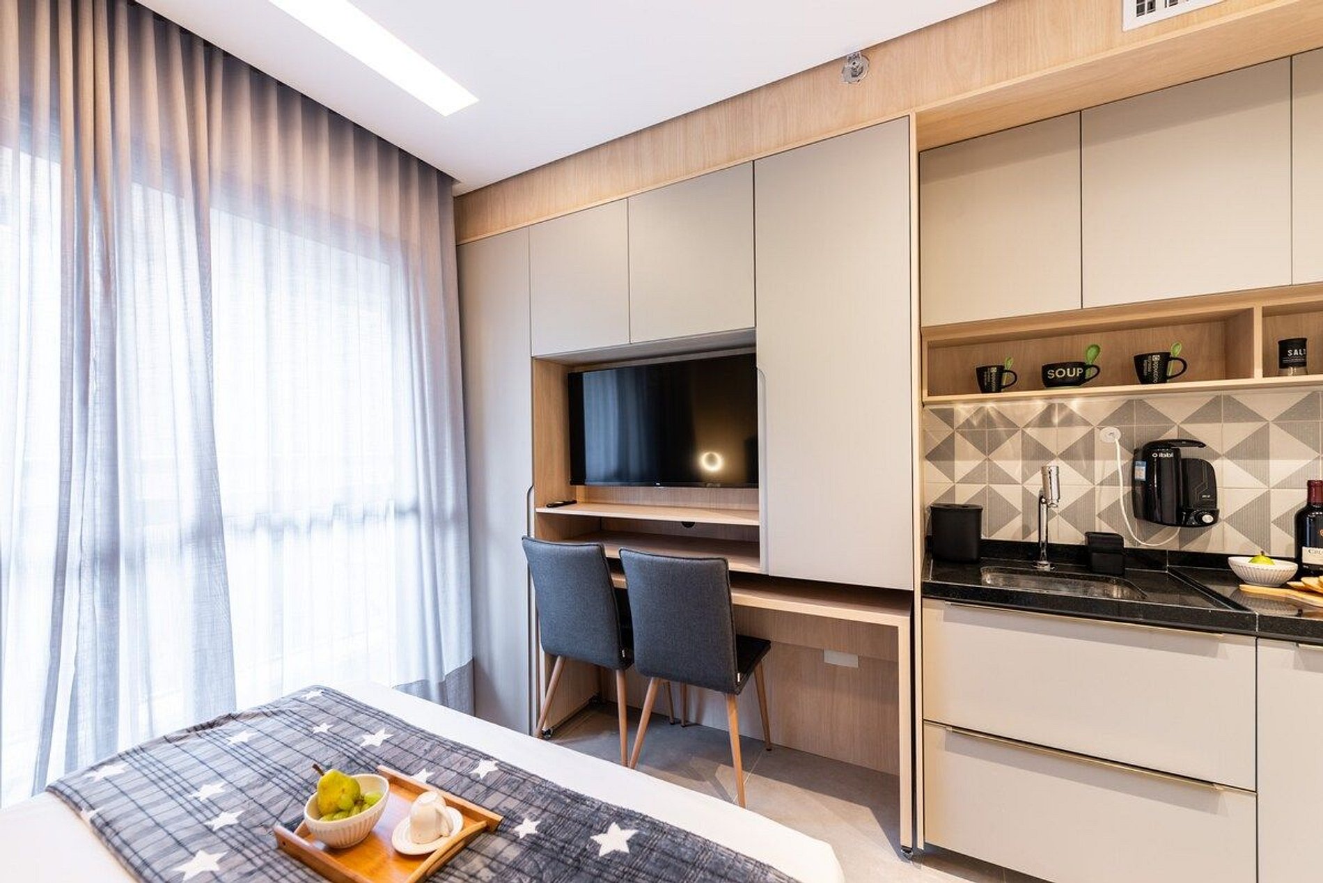 O studio é novo, bem decorado e com produtos de alta qualidade, trazendo conforto e aconchego em sua hospedagem. O prédio está localizado na zona sul de São Paulo, em um dos bairros mais sofisticados da cidade, chamado Moema. Ao redor do bairro é possível conhecer inúmeros restaurantes famosos, festas e o parque Ibirapuera. O edifício é residencial, com portaria 24 horas, coworking, piscina no rooftop e elevador.