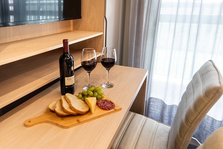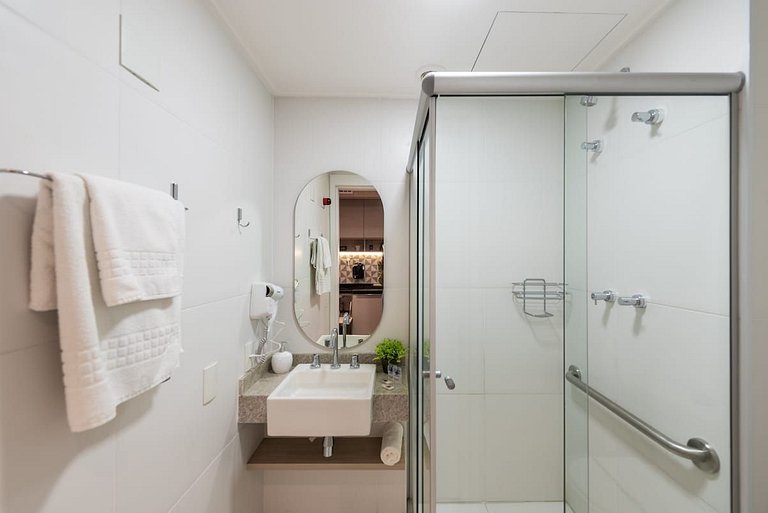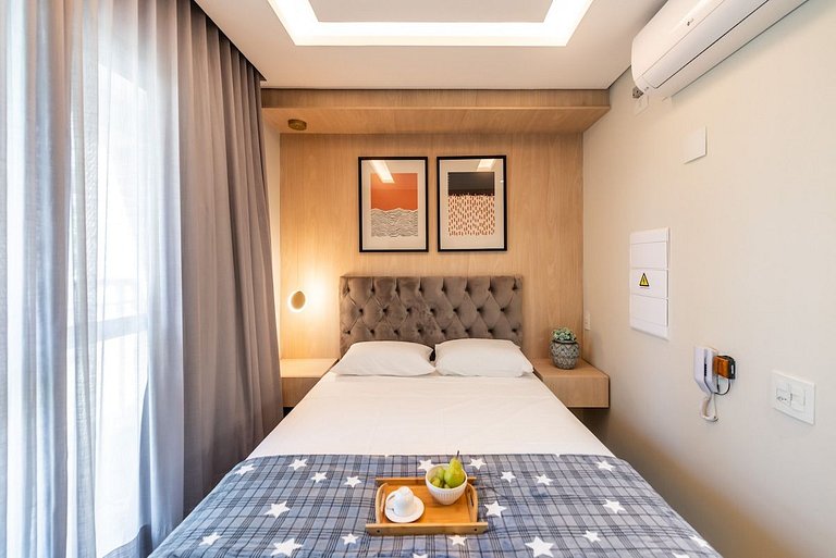 Nosso Loft é compacto, design moderno e bem decorado, tem 22 metros quadrados de área, contém uma cama de casal aconchegante e um chuveiro delicioso. Ideal para quem vem a trabalho ou a passeio. O edifício é lindíssimo e oferece comodidades como: piscina, coworking, academia e lavanderia OMO, facilitando a hospedagem e conforto de nossos hóspedes.